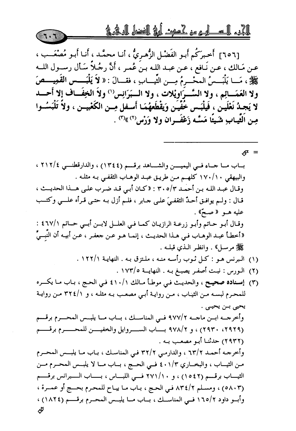 656 - أَخْبَرَكُمْ أَبُو الْفَضْلِ الزُّهْرِيُّ، أنا مُحَمَّدٌ، أنا أَبُو مُصْعَبٍ، عَنْ مَالِكٍ، عَنْ نَافِعٍ، عَنْ عَبْدِ اللَّهِ بْنِ عُمَرَ، أَنَّ رَجُلًا سَأَلَ رَسُولَ اللَّهِ صَلَّى اللَّهُ عَلَيْهِ وَسَلَّمَ: مَا يَلْبَسُ الْمُحْرِمُ مِنَ الثِّيَابِ؟ فَقَالَ: «لَا يَلْبَسُ الْقَمِيصَ، وَلَا الْعَمَائِمَ، وَلَا السَّرَاوِيلَاتِ، وَلَا الْبَرَانِسَ، وَلَا الْخِفَافَ إِلَّا أَحَدٌ لَا يَجِدُ نَعْلَيْنِ، فَيَلْبَسْ خُفَّيْنِ وَيَقْطَعْهُمَا أَسْفَلَ مِنَ الْكَعْبَيْنِ، وَلَا تَلْبَسُوا مِنَ الثِّيَابِ شَيْئًا مَسَّهُ زَعْفَرَانٌ وَلَا وَرْسٌ»