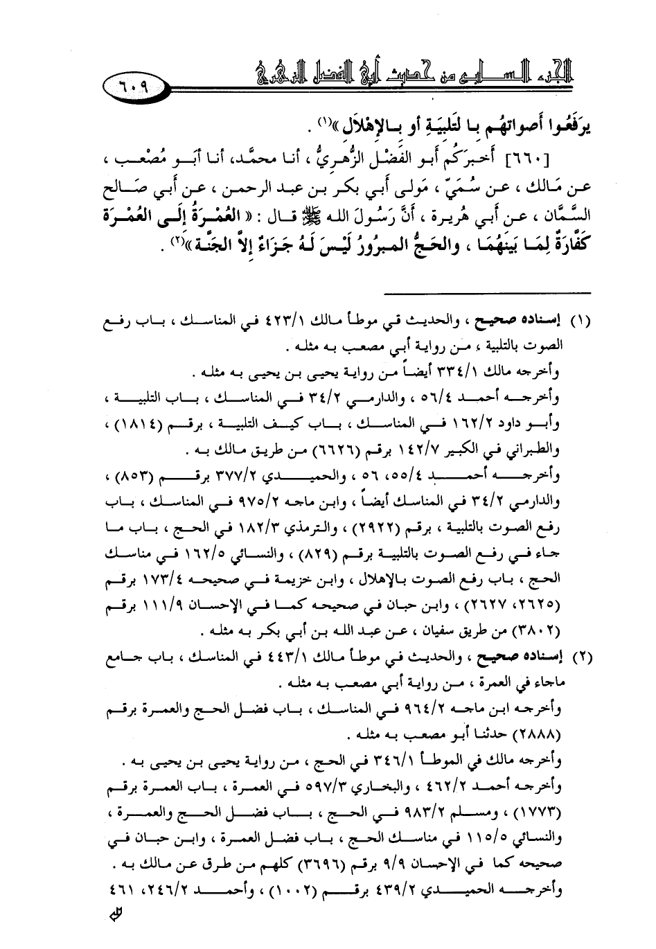660 - أَخْبَرَكُمْ أَبُو الْفَضْلِ الزُّهْرِيُّ، أنا مُحَمَّدٌ، أنا أَبُو مُصْعَبٍ، عَنْ مَالِكٍ، عَنْ سُمَيٍّ مَوْلَى أَبِي بَكْرِ بْنِ عَبْدِ الرَّحْمَنِ، عَنْ أَبِي صَالِحٍ السَّمَّانِ، عَنْ أَبِي هُرَيْرَةَ، أَنَّ رَسُولَ اللَّهِ صَلَّى اللَّهُ عَلَيْهِ وَسَلَّمَ قَالَ: «الْعُمْرَةُ إِلَى الْعُمْرَةِ كَفَّارَةٌ لِمَا بَيْنَهُمَا، وَالْحَجُّ الْمَبْرُورُ لَيْسَ لَهُ جَزَاءٌ إِلَّا الْجَنَّةُ»