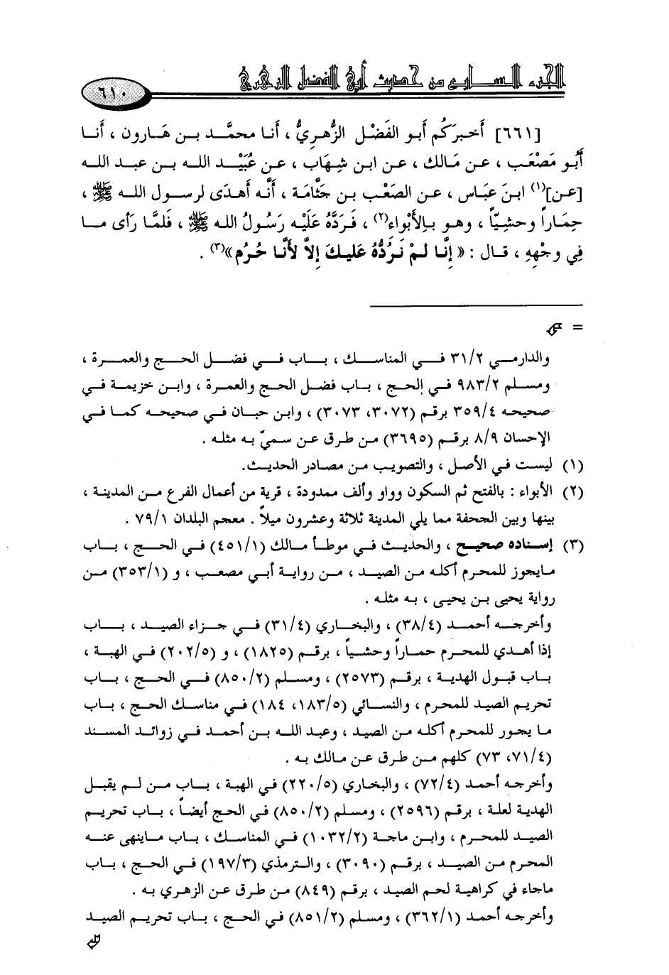 661 - أَخْبَرَكُمْ أَبُو الْفَضْلِ الزُّهْرِيُّ، أنا مُحَمَّدُ بْنُ هَارُونَ، أنا أَبُو مُصْعَبٍ، عَنْ مَالِكٍ، عَنِ ابْنِ شِهَابٍ، عَنْ عُبَيْدِ اللَّهِ بْنِ عَبْدِ اللَّهِ، عَنِ ابْنِ عَبَّاسٍ، عَنِ الصَّعْبِ بْنِ جَثَّامَةَ، أَنَّهُ أَهْدَى لِرَسُولِ اللَّهِ صَلَّى اللَّهُ عَلَيْهِ وَسَلَّمَ، حِمَارًا وَحْشِيًّا، وَهُوَ بِالْأَبْوَاءِ، فَرَدَّهُ عَلَيْهِ رَسُولُ اللَّهِ صَلَّى اللَّهُ عَلَيْهِ وَسَلَّمَ، فَلَمَّا رَأَى مَا فِي وَجْهِهِ قَالَ: «إِنَّا لَمْ نَرُدَّهُ عَلَيْكَ إِلَّا لِأَنَّا حُرُمٌ»