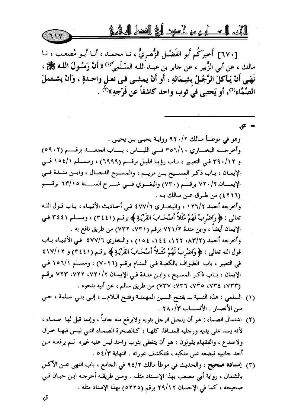 670 - أَخْبَرَكُمْ أَبُو الْفَضْلِ الزُّهْرِيُّ، نا مُحَمَّدٌ، أنا أَبُو مُصْعَبٍ، نا مَالِكٌ، عَنْ أَبِي الزُّبَيْرِ، عَنْ جَابِرِ بْنِ عَبْدِ اللَّهِ السُّلَمِيِّ، أَنَّ رَسُولَ اللَّهِ صَلَّى اللَّهُ عَلَيْهِ وَسَلَّمَ: «نَهَى أَنْ يَأْكُلَ الرَّجُلُ بِشِمَالِهِ، أَوْ أَنْ يُمْشَىَ فِي نَعْلٍ وَاحِدَةٍ، وَأَنْ يَشْتَمِلَ الصَّمَّاءَ، أَوْ يَحْتَبِيَ فِي ثَوْبٍ وَاحِدٍ كَاشِفًا عَنْ فَرْجِهِ»