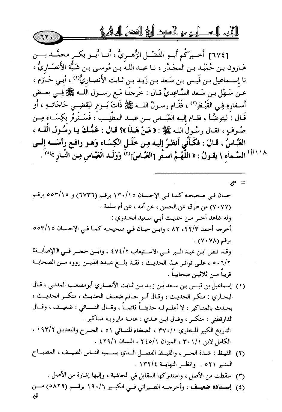 674 - أَخْبَرَكُمْ أَبُو الْفَضْلِ الزُّهْرِيُّ، أنا أَبُو بَكْرٍ مُحَمَّدُ بْنُ هَارُونَ بْنِ حُمَيْدِ بْنِ الْمُجَدَّرِ، نا عَبْدُ اللَّهِ بْنُ مُوسَى بْنِ شَبَّةَ الْأَنْصَارِيُّ، نا إِسْمَاعِيلُ بْنُ قَيْسِ بْنِ سَعْدِ بْنِ زَيْدِ بْنِ ثَابِتٍ الْأَنْصَارِيِّ أَبِي حَازِمٍ، عَنْ سَهْلِ بْنِ سَعْدٍ السَّاعِدِيِّ، قَالَ: خَرَجْنَا مَعَ رَسُولِ اللَّهِ صَلَّى اللَّهُ عَلَيْهِ وَسَلَّمَ فِي بَعْضِ أَسْفَارِهِ فِي الْقَيْظِ، فَقَامَ رَسُولُ اللَّهِ صَلَّى اللَّهُ عَلَيْهِ وَسَلَّمَ ذَاتَ يَوْمٍ لِيَقْضِيَ حَاجَاتِهِ، أَوْ قَالَ: لِيَتَوَضَّأَ، فَقَامَ إِلَيْهِ الْعَبَّاسُ بْنُ عَبْدِ الْمُطَّلِبِ، فَسَتَرَهُ بِكِسَاءٍ مِنْ صُوفٍ فَقَالَ رَسُولُ اللَّهِ صَلَّى اللَّهُ عَلَيْهِ وَسَلَّمَ: «مَنْ هَذَا»؟ قَالَ: عَمُّكَ يَا رَسُولَ اللَّهِ، الْعَبَّاسُ قَالَ: فَكَأَنِّي أَنْظُرُ إِلَيْهِ مِنْ خَلَلِ الْكِسَاءِ وَهُوَ رَافِعٌ رَأْسَهُ إِلَى السَّمَاءِ يَقُولُ: «اللَّهُمَّ اسْتُرِ الْعَبَّاسَ وَوَلَدَ الْعَبَّاسِ مِنَ النَّارِ»