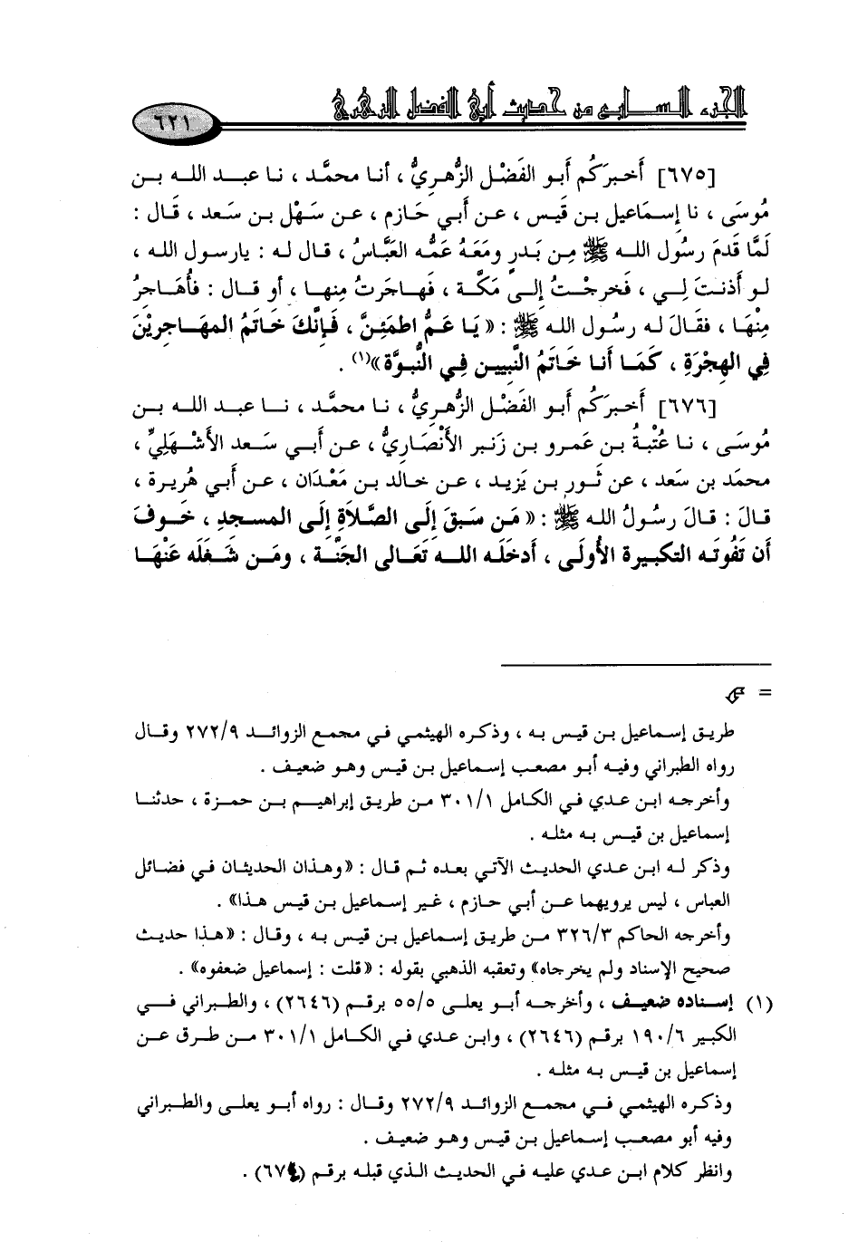 675 - أَخْبَرَكُمْ أَبُو الْفَضْلِ الزُّهْرِيُّ، أنا مُحَمَّدٌ، نا عَبْدُ اللَّهِ بْنُ مُوسَى، نا إِسْمَاعِيلُ بْنُ قَيْسٍ، عَنْ أَبِي حَازِمٍ، عَنْ سَهْلِ بْنِ سَعْدٍ، قَالَ: لَمَّا قَدِمَ رَسُولُ اللَّهِ صَلَّى اللَّهُ عَلَيْهِ وَسَلَّمَ مِنْ بَدْرٍ وَمَعَهُ عَمُّهُ الْعَبَّاسُ قَالَ لَهُ: يَا رَسُولَ اللَّهِ، لَوْ أَذِنْتَ لِي، فَخَرَجْتُ إِلَى مَكَّةَ، فَهَاجَرْتُ مِنْهَا - أَوْ قَالَ: فَأُهَاجِرُ مِنْهَا -، فَقَالَ لَهُ رَسُولُ اللَّهِ صَلَّى اللَّهُ عَلَيْهِ وَسَلَّمَ: «يَا عَمِّ اطْمَئِنَّ، فَإِنَّكَ خَاتَمُ الْمُهَاجِرِينَ فِي الْهِجْرَةِ، كَمَا أَنَا خَاتَمُ النَّبِيِّينَ فِي النُّبُوَّةِ»