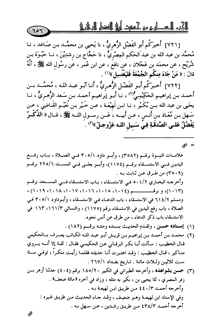 722 - أَخْبَرَكُمْ أَبُو الْفَضْلِ الزُّهْرِيُّ، أنا أَبُو عَبْدِ اللَّهِ مُحَمَّدُ بْنُ أَحْمَدَ بْنِ إِبْرَاهِيمَ الْحَكِيمِيُّ , نا أَبُو إِبْرَاهِيمَ أَحْمَدُ بْنُ سَعْدٍ الزُّهْرِيُّ , نا يَحْيَى بْنُ عَبْدِ اللَّهِ بْنِ بُكَيْرٍ , نا ابْنُ لَهِيعَةَ، عَنْ خَيْرِ بْنِ نُعَيْمٍ الْقَاضِي، عَنْ سَهْلِ بْنِ مُعَاذِ بْنِ أَنَسٍ , عَنْ أَبِيهِ، عَنْ رَسُولِ اللَّهِ صَلَّى اللَّهُ عَلَيْهِ وَسَلَّمَ , قَالَ: «الذِّكْرُ يَفْضُلُ عَلَى الصَّدَقَةِ فِي سَبِيلِ اللَّهِ عَزَّ وَجَلَّ»