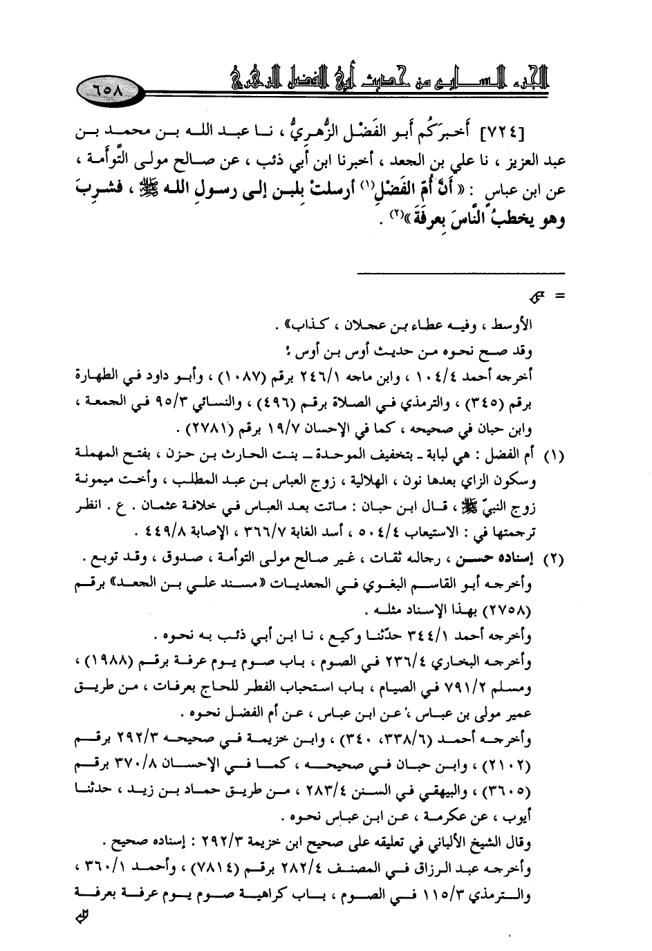 724 - أَخْبَرَكُمْ أَبُو الْفَضْلِ الزُّهْرِيُّ، نا عَبْدُ اللَّهِ بْنُ مُحَمَّدِ بْنِ عَبْدِ الْعَزِيزِ، نا عَلِيُّ بْنُ الْجَعْدِ، أَخْبَرَنَا ابْنُ أَبِي ذِئْبٍ، عَنْ صَالِحٍ مَوْلَى التَّوْأَمَةِ، عَنِ ابْنِ عَبَّاسٍ: «أَنَّ أُمَّ الْفَضْلِ أَرْسَلَتْ بِلَبَنٍ إِلَى رَسُولِ اللَّهِ صَلَّى اللَّهُ عَلَيْهِ وَسَلَّمَ، فَشَرِبَ وَهُوَ يَخْطُبُ النَّاسَ بِعَرَفَةَ»