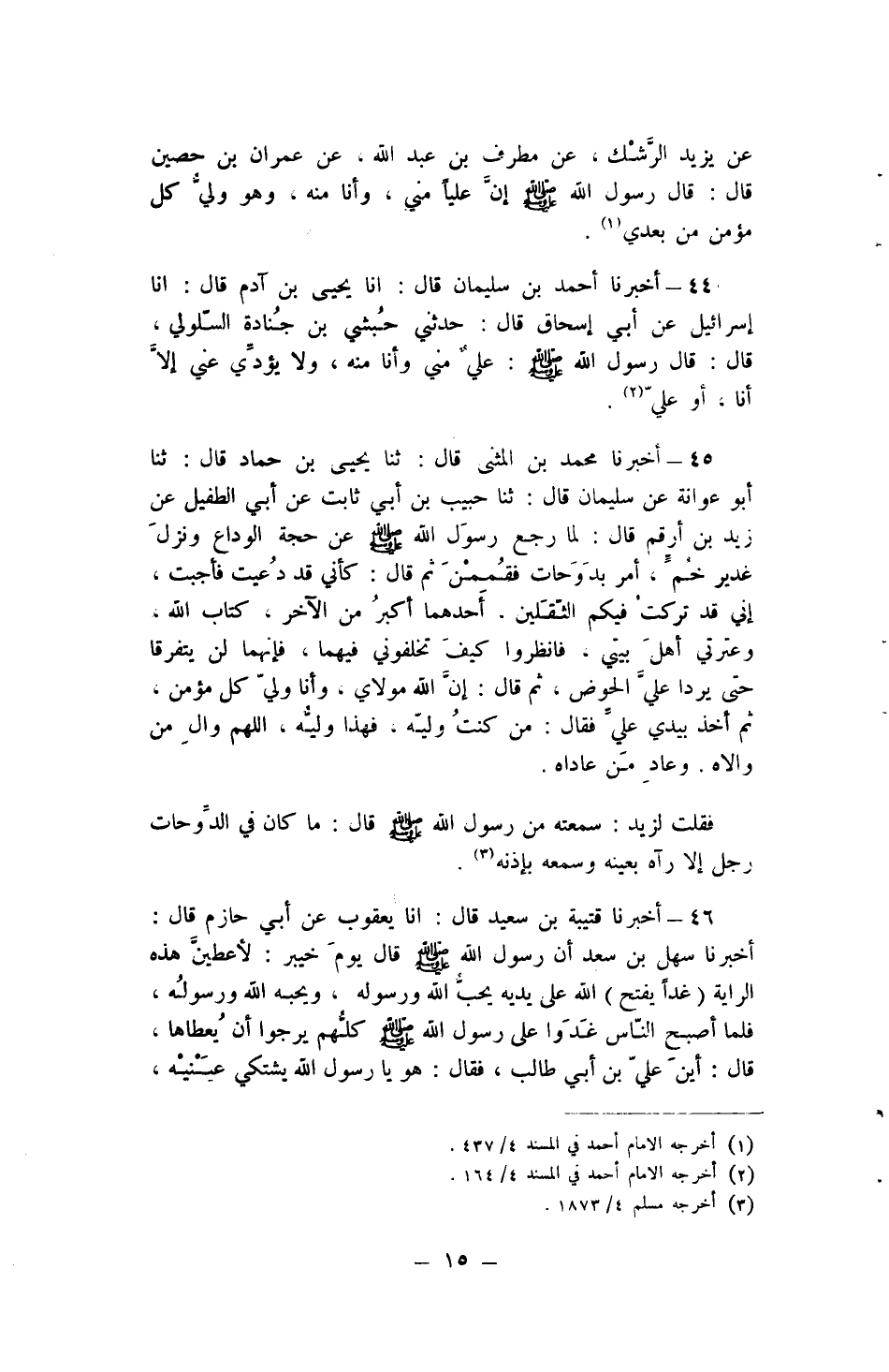 45 - أخبرنَا مُحَمَّد بن الْمثنى قَالَ ثَنَا يحيى بن حَمَّاد قَالَ ثَنَا أَبُو عوَانَة عَن سُلَيْمَان قَالَ ثَنَا حبيب بن أبي ثَابت عَن أبي الطُّفَيْل عَن زيد بن أَرقم قَالَ لما رَجَعَ رَسُول الله صلى الله عَلَيْهِ وَسلم عَن حجَّة الْوَدَاع وَنزل غَدِير خم أَمر بدوحات فقممن ثمَّ قَالَ كَأَنِّي قد دعيت فأجبت إِنِّي قد تركت فِيكُم الثقلَيْن أَحدهمَا أكبر من الآخر كتاب الله وعترتي أهل بَيْتِي فانظروا كَيفَ تخلفوني فيهمَا فَإِنَّهُمَا لن يَتَفَرَّقَا حَتَّى يردا عَليّ الْحَوْض ثمَّ قَالَ إِن الله مولَايَ وَأَنا ولي كل مُؤمن ثمَّ أَخذ بيَدي عَليّ فَقَالَ من كنت وليه فَهَذَا وليه اللَّهُمَّ وَال من وَالَاهُ وَعَاد من عَادَاهُ