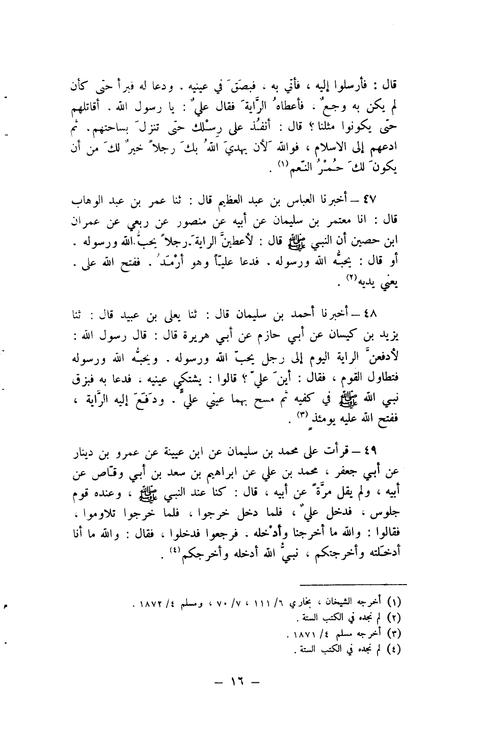 47 - أخبرنَا الْعَبَّاس بن عبد الْعَظِيم قَالَ ثَنَا عمر بن عبد الْوَهَّاب قَالَ أَنا مُعْتَمر بن سُلَيْمَان عَن أَبِيه عَن مَنْصُور عَن ربعي عَن عمرَان ابْن حُصَيْن أَن النَّبِي صلى الله عَلَيْهِ وَسلم قَالَ لَأُعْطيَن الرَّايَة رجلا يحب الله وَرَسُوله أَو قَالَ يُحِبهُ الله وَرَسُوله فَدَعَا عليا وَهُوَ أرمد فَفتح الله على يَعْنِي يَدَيْهِ