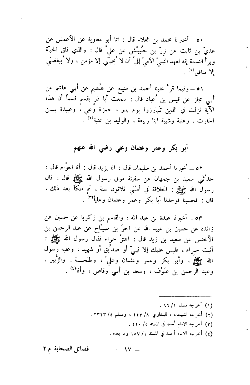 53 - أخبرنَا عَبدة بن عبد الله وَالقَاسِم بن زَكَرِيَّا عَن حُسَيْن عَن زَائِدَة عَن حُسَيْن بن عبيد الله عَن الْحر بن صياح عَن عبد الرَّحْمَن بن الْأَخْنَس عَن سعيد بن زيد قَالَ اهتز حراء فَقَالَ رَسُول الله صلى الله عَلَيْهِ وَسلم أثبت حراء فَلَيْسَ عَلَيْك إِلَّا نَبِي أَو صديق أَو شَهِيد وَعَلِيهِ رَسُول الله صلى الله عَلَيْهِ وَسلم وَأَبُو بكر وَعمر وَعُثْمَان وَعلي وَطَلْحَة وَالزُّبَيْر وَعبد الرَّحْمَن بن عَوْف وَسعد بن أبي وَقاص وَأَنا