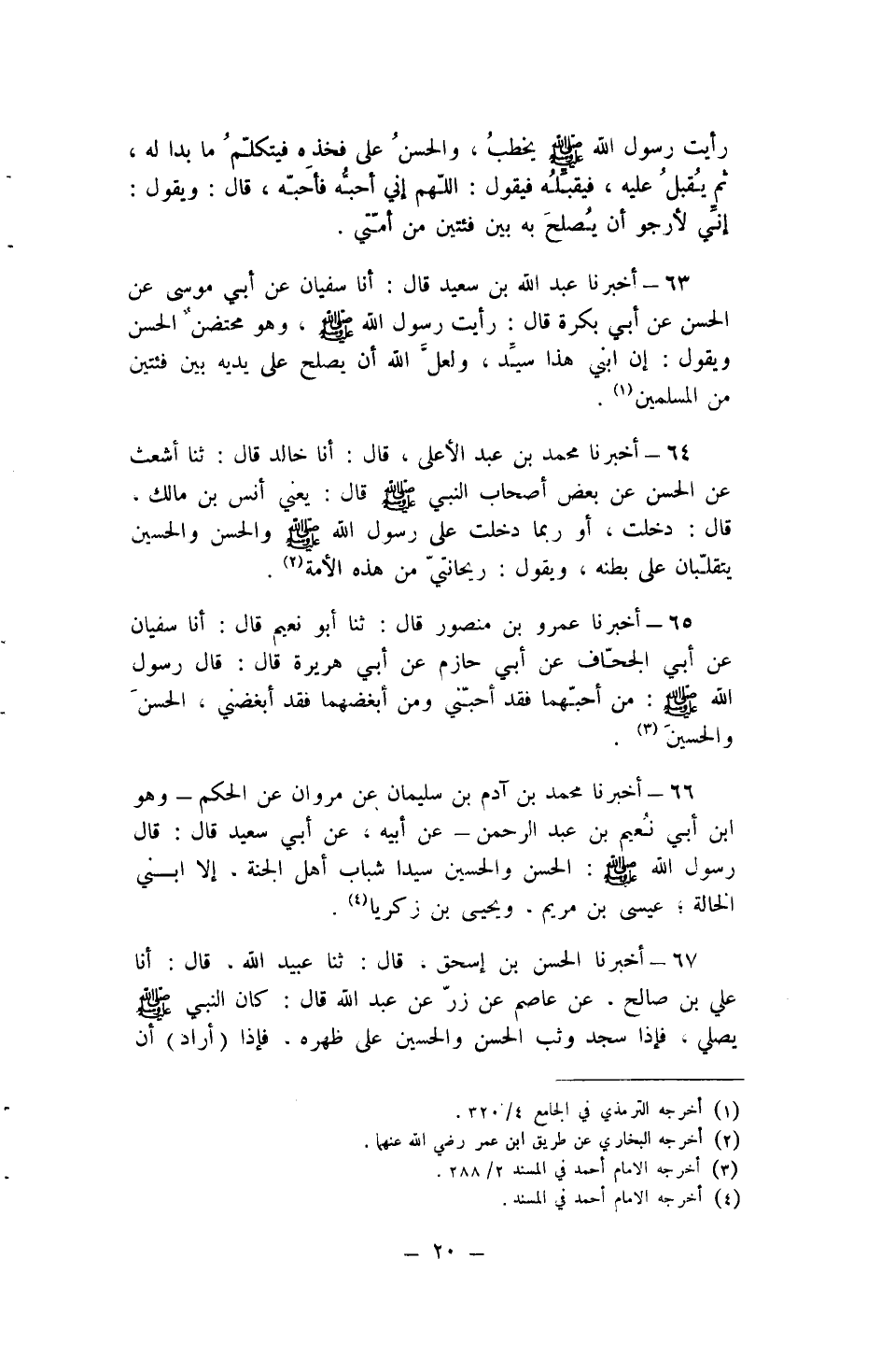 67 - أخبرنَا الْحسن بن إِسْحَاق قَالَ ثَنَا عبيد الله قَالَ أَنا عَليّ بن صَالح عَن عَاصِم عَن زر عَن عبد الله قَالَ كَانَ النَّبِي صلى الله عَلَيْهِ وَسلم يُصَلِّي فَإِذا سجد وثب الْحسن وَالْحُسَيْن على ظَهره فَإِذا أَرَادَ أَن يمنعوهما أَشَارَ إِلَيْهِم أَن دعوهما فَلَمَّا صلى وضعهما فِي حجره ثمَّ قَالَ من أَحبَّنِي فليحب هذَيْن