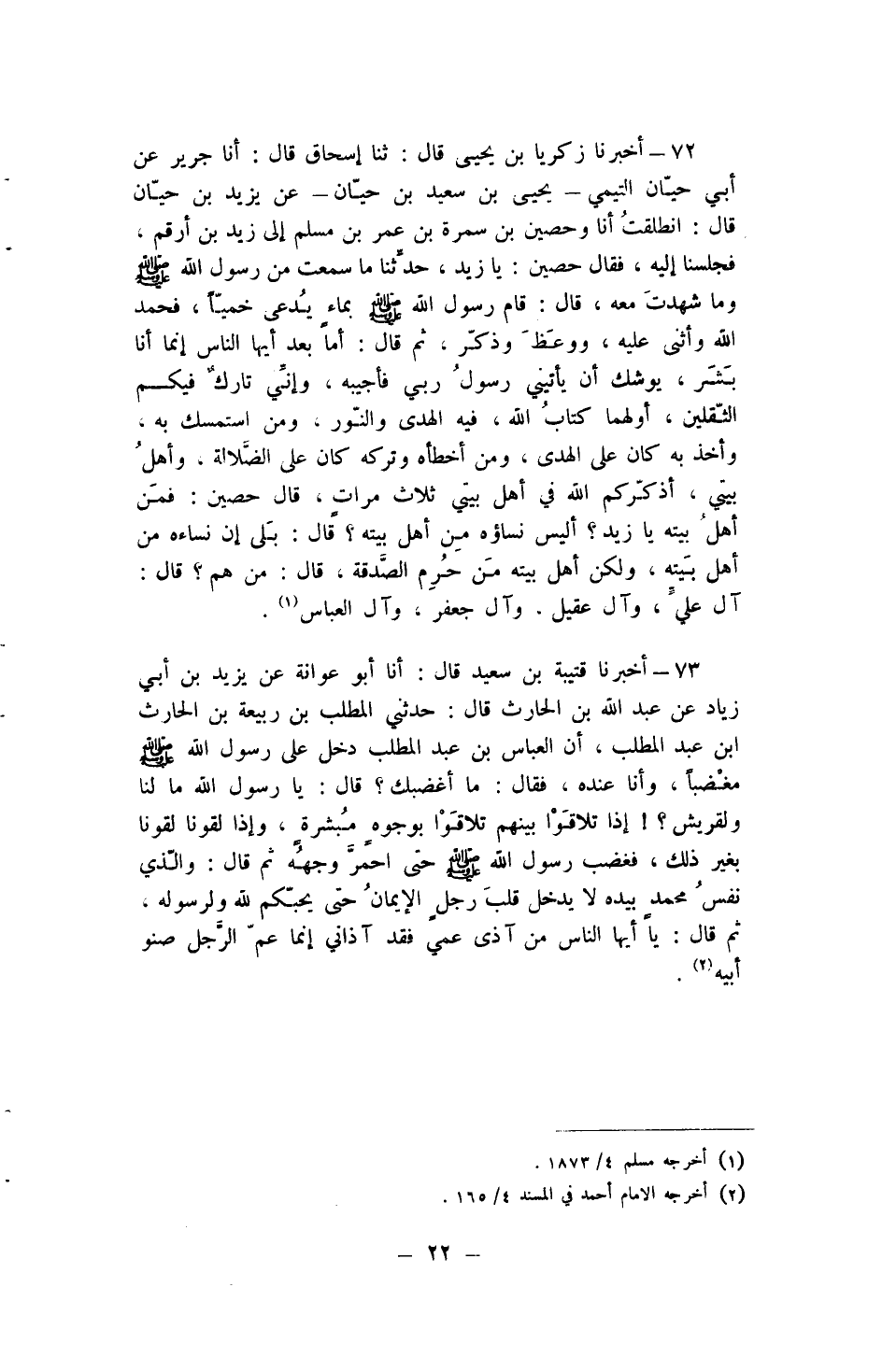72 - أخبرنَا زَكَرِيَّا بن يحيى قَالَ ثَنَا إِسْحَاق قَالَ أَنا جرير عَن أبي حَيَّان التَّيْمِيّ يحيى بن سعيد بن حَيَّان عَن يزِيد بن حَيَّان قَالَ انْطَلَقت أَنا وحصين بن سَمُرَة بن عمر بن مُسلم إِلَى زيد بن أَرقم فَجَلَسْنَا إِلَيْهِ فَقَالَ الْحصين يَا زيد حَدثنَا مَا سَمِعت من رَسُول الله صلى الله عَلَيْهِ وَسلم وَمَا شهِدت مَعَه قَالَ قَامَ رَسُول الله صلى الله عَلَيْهِ وَسلم بِمَاء يدعى خميا فَحَمدَ الله وَأثْنى عَلَيْهِ وَوعظ وَذكر ثمَّ قَالَ أما بعد أَيهَا النَّاس إِنَّمَا أَنا بشر يُوشك أَن يأتيني رَسُول رَبِّي فَأُجِيبَهُ وَإِنِّي تَارِك فِيكُم الثقلَيْن أَولهمَا كتاب الله فِيهِ الْهدى والنور وَمن استمسك بِهِ وَأخذ بِهِ كَانَ على الْهدى وَمن أخطأه وَتَركه كَانَ على الضَّلَالَة وَأهل بَيْتِي أذكركم الله فِي أهل بَيْتِي ثَلَاث مَرَّات قَالَ حُصَيْن فَمن أهل بَيته يَا زيد أَلَيْسَ نساؤه من أهل بَيته قَالَ بلَى إِن نِسَاءَهُ من أهل بَيته وَلَكِن أهل بَيته من حرم الصَّدَقَة قَالَ من هم قَالَ آل عَليّ وَآل عقيل وَآل جَعْفَر وَآل الْعَبَّاس