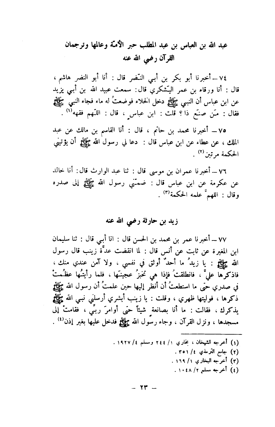 76 - أخبرنَا عمرَان بن مُوسَى قَالَ ثَنَا عبد الْوَارِث قَالَ أَنا خَالِد عَن عِكْرِمَة عَن ابْن عَبَّاس قَالَ ضمني رَسُول الله صلى الله عَلَيْهِ وَسلم إِلَى صَدره وَقَالَ اللَّهُمَّ علمه الْحِكْمَة
