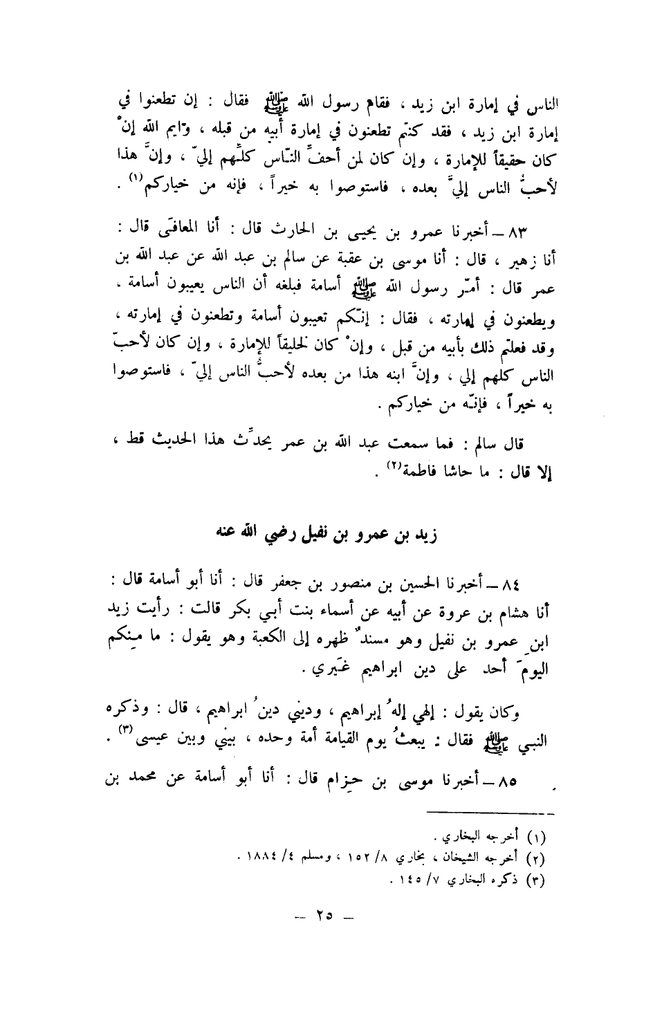 83 - أخبرنَا عَمْرو بن يحيى بن الْحَارِث قَالَ أَنا الْمعَافى قَالَ أَنا زُهَيْر قَالَ أَنا مُوسَى بن عقبَة عَن سَالم بن عبد الله عَن عبد الله بن عمر قَالَ أَمر رَسُول الله صلى الله عَلَيْهِ وَسلم أُسَامَة فَبَلغهُ أَن النَّاس يعيبون أُسَامَة ويطعنون فِي إمارته فَقَالَ إِنَّكُم تعيبون أُسَامَة وتطعنون فِي إمارته وَقد فَعلْتُمْ ذَلِك بِأَبِيهِ من قبل وَإِن كَانَ لخليقا للإمارة وَإِن كَانَ لأحب النَّاس كلهم إِلَيّ وَإِن ابْنه هَذَا من بعده لأحب النَّاس إِلَيّ فَاسْتَوْصُوا بِهِ خيرا فَإِنَّهُ من خياركم
