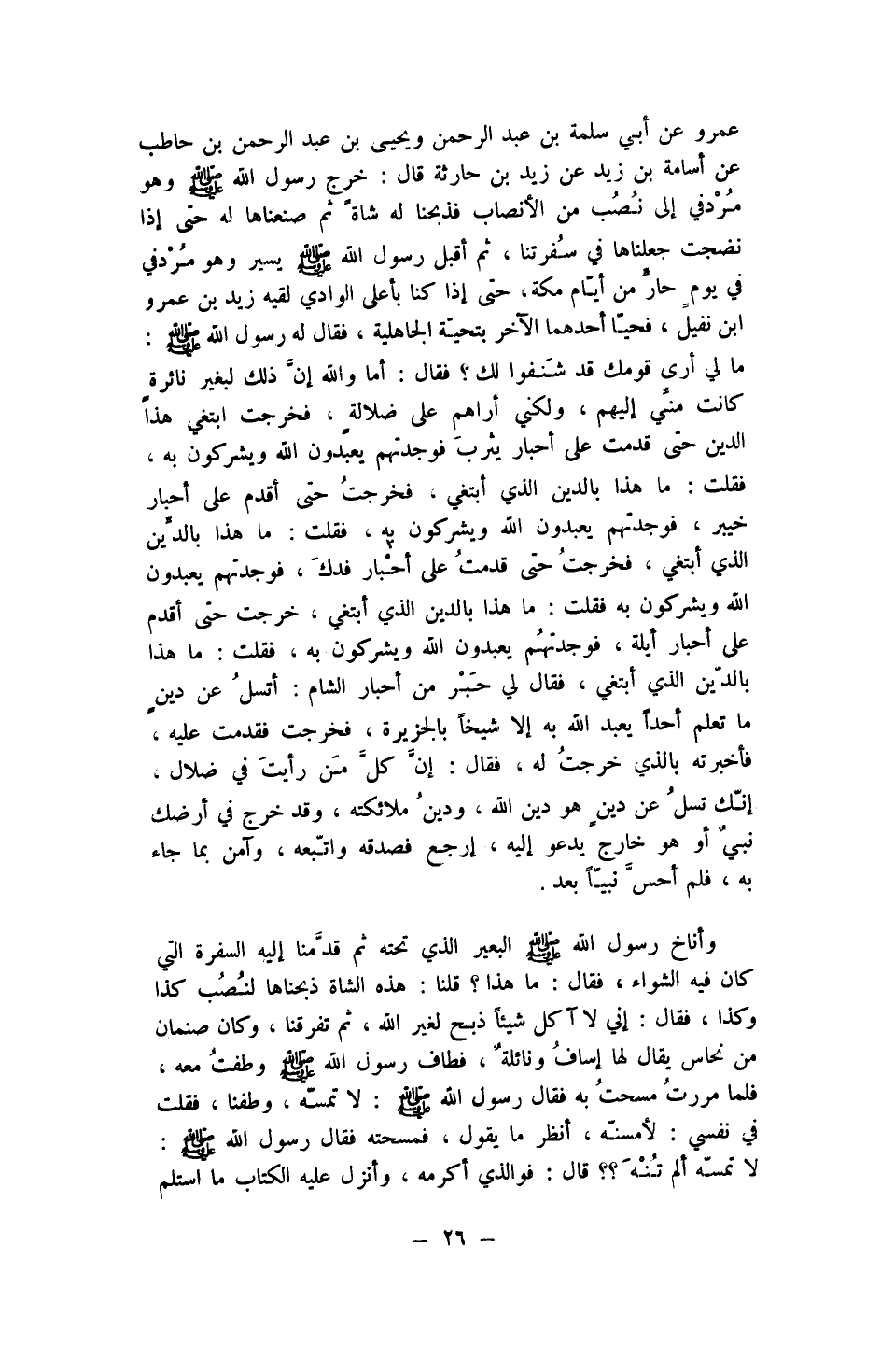 عَمْرو من أبي سَلمَة بن عبد الرَّحْمَن وَيحيى بن عبد الرَّحْمَن بن حَاطِب عَن أُسَامَة بن زيد عَن زيد بن حَارِثَة قَالَ خرج رَسُول الله صلى الله عَلَيْهِ وَسلم وَهُوَ مردفي إِلَى نصب من الأنصاب فذبحنا لَهُ شَاة ثمَّ صنعناها لَهُ حَتَّى إِذا نَضِجَتْ جعلناها فِي سفرتنا ثمَّ أقبل رَسُول الله صلى الله عَلَيْهِ وَسلم يسير وَهُوَ مردفي فِي يَوْم حَار من أَيَّام مَكَّة حَتَّى إِذا كُنَّا بِأَعْلَى الْوَادي لقِيه زيد بن عَمْرو ابْن نفَيْل فَحَيَّا أَحدهمَا الآخر بِتَحِيَّة الْجَاهِلِيَّة فَقَالَ لَهُ رَسُول الله صلى الله عَلَيْهِ وَسلم مَا لي أرى قَوْمك قد شنفوا لَك فَقَالَ أما وَالله إِن ذَلِك لبغير نائرة كَانَت مني إِلَيْهِم وَلَكِنِّي أَرَاهُم على ضَلَالَة فَخرجت ابْتغِي هَذَا الدّين حَتَّى قدمت على أَحْبَار يثرب فوجدتهم يعْبدُونَ الله ويشركون بِهِ فَقلت مَا هَذَا بِالدّينِ الَّذِي أَبْتَغِي فَخرجت حَتَّى أقدم على أَحْبَار خَيْبَر فوجدتهم يعْبدُونَ الله ويشركون بِهِ فَقلت مَا هَذَا بِالدّينِ الَّذِي أَبْتَغِي فَخرجت حَتَّى قدمت على أَحْبَار فدك فوجدتهم يعْبدُونَ الله ويشركون بِهِ فَقلت مَا هَذَا بِالدّينِ الَّذِي أَبْتَغِي خرجت حَتَّى أقدم على أَحْبَار أَيْلَة فوجدتهم يعْبدُونَ الله ويشركون بِهِ فَقلت مَا هَذَا بِالدّينِ الَّذِي أَبْتَغِي فَقَالَ لي حبر من أَحْبَار الشَّام أتسل عَن دين مَا تعلم أحدا يعبد الله بِهِ إِلَّا شَيخا بالجزيرة فَخرجت فَقدمت عَلَيْهِ فَأَخْبَرته بِالَّذِي خرجت لَهُ فَقَالَ إِن كل من رَأَيْت فِي ضلال إِنَّك تسل عَن دين هُوَ دين الله وَدين مَلَائكَته وَقد خرج فِي أَرْضك نَبِي أَو هُوَ خَارج يَدْعُو إِلَيْهِ إرجع فَصدقهُ وَاتبعهُ وآمن بِمَا جَاءَ بِهِ فَلم أحس نَبيا بعد