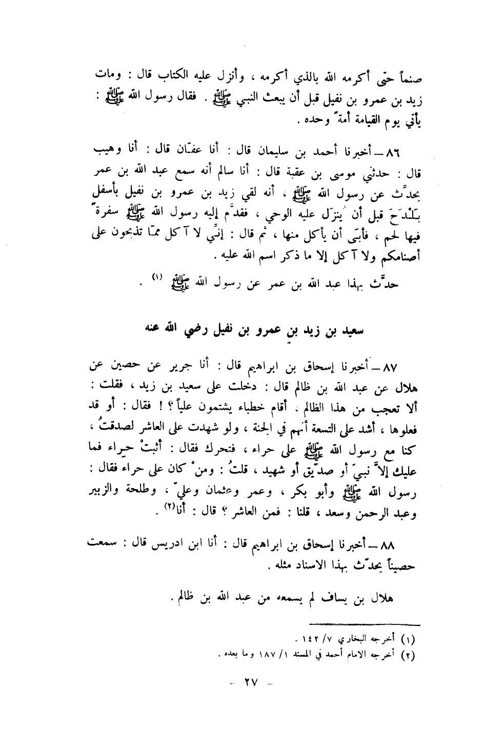 86 - أخبرنَا أَحْمد بن سُلَيْمَان قَالَ أَنا عَفَّان قَالَ أَنا وهيب قَالَ حَدثنِي مُوسَى بن عقبَة قَالَ أَنا سَالم أَنه سمع عبد الله بن عمر يحدث عَن رَسُول الله صلى الله عَلَيْهِ وَسلم أَنه لَقِي زيد بن عَمْرو بن نفَيْل بِأَسْفَل بلدح قبل أَن ينزل عَلَيْهِ الْوَحْي فَقدم إِلَيْهِ رَسُول الله صلى الله عَلَيْهِ وَسلم سفرة فِيهَا لحم فَأبى أَن يَأْكُل مِنْهَا ثمَّ قَالَ إِنِّي لَا آكل مِمَّا تذبحون على أصنامكم وَلَا آكل إِلَّا مَا ذكر إسم الله عَلَيْهِ