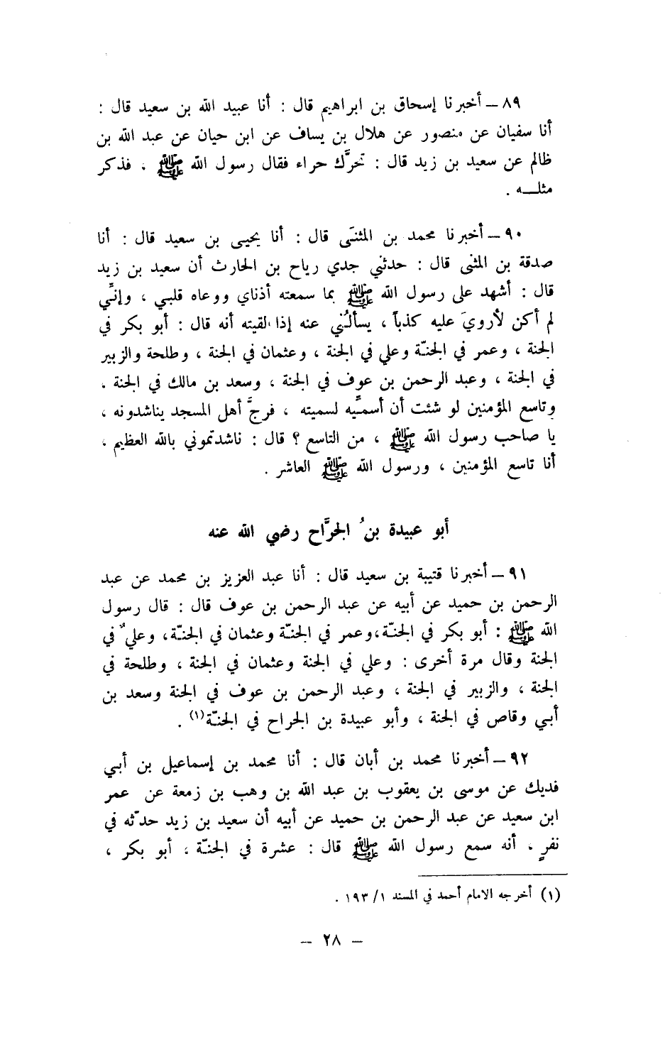92 - أخبرنَا مُحَمَّد بن أبان قَالَ أَنا مُحَمَّد بن إِسْمَاعِيل بن أبي فديك عَن مُوسَى بن يَعْقُوب بن عبد الله بن وهب بن زَمعَة عَن عمر ابْن سعيد عَن عبد الرَّحْمَن بن حميد عَن أَبِيه أَن سعيد بن زيد حَدثهُ فِي نفر أَنه سمع رَسُول الله صلى الله عَلَيْهِ وَسلم قَالَ عشرَة فِي الْجنَّة أَبُو بكر وَعمر وَعُثْمَان وَعلي وَطَلْحَة وَالزُّبَيْر وَعبد الرَّحْمَن وَأَبُو عُبَيْدَة ابْن عبد الله وَسعد بن أبي وَقاص فعد هَؤُلَاءِ التِّسْعَة ثمَّ سكت عَن الْعَاشِر فَقَالَ الْقَوْم ننشدك الله يَا أَبَا الْأَعْوَر أَنْت الْعَاشِر قَالَ إِذْ نشدتموني بِاللَّه أَبَا الْأَعْوَر فِي الْجنَّة