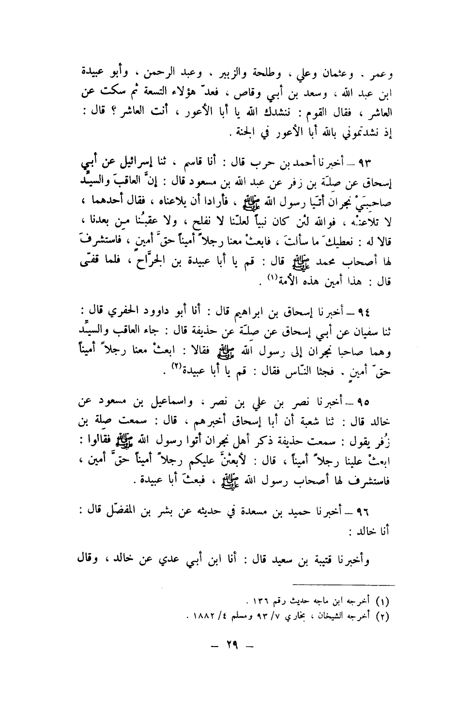 93 - أخبرنَا أَحْمد بن حَرْب قَالَ أَنا قَاسم ثَنَا إِسْرَائِيل عَن أبي إِسْحَاق عَن صلَة بن زفر عَن عبد الله بن مَسْعُود قَالَ إِن العاقب وَالسَّيِّد صَاحِبي نَجْرَان أَتَيَا رَسُول الله صلى الله عَلَيْهِ وَسلم فأرادا أَن يلاعناه فَقَالَ أَحدهمَا لَا تلاعنه فو الله لَئِن كَانَ نَبيا لَعَلَّنَا لَا نفلح وَلَا عقبنا من بَعدنَا قَالَا لَهُ نعطيك مَا سَأَلت فَابْعَثْ مَعنا رجلا أَمينا حق أَمِين فاستشرف لَهَا أَصْحَاب مُحَمَّد صلى الله عَلَيْهِ وَسلم قَالَ قُم يَا أَبَا عُبَيْدَة بن الْجراح فَلَمَّا قفى قَالَ هَذَا أَمِين هَذِه الْأمة