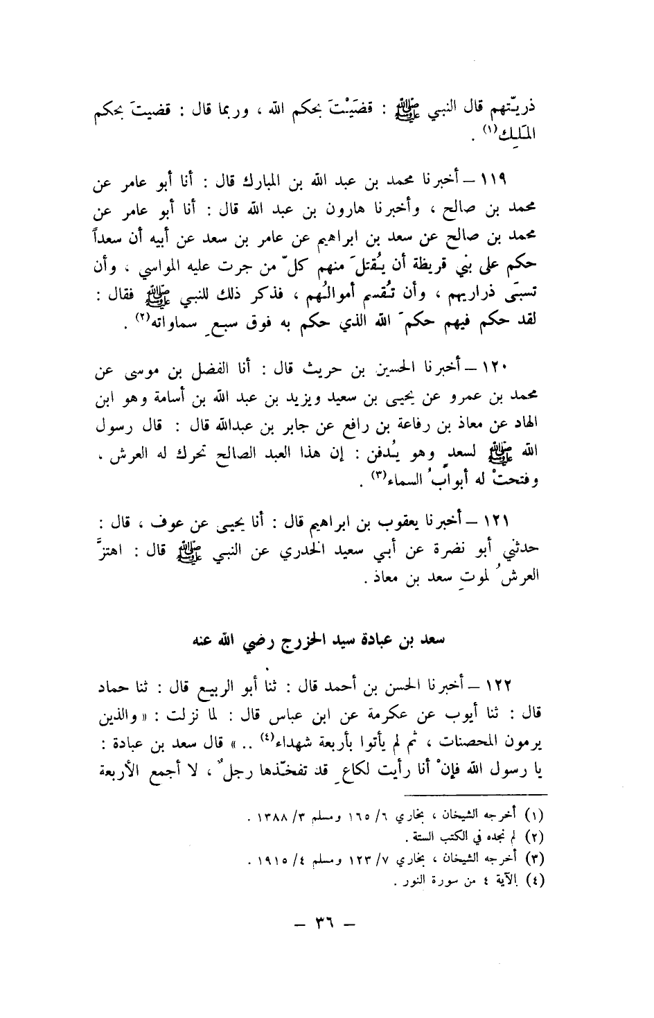 122 - أخبرنَا الْحسن بن أَحْمد قَالَ ثَنَا أَبُو الرّبيع قَالَ ثَنَا حَمَّاد قَالَ ثَنَا أَيُّوب عَن عِكْرِمَة عَن ابْن عَبَّاس قَالَ لما نزلت {وَالَّذين يرْمونَ الْمُحْصنَات ثمَّ لم يَأْتُوا بأَرْبعَة شُهَدَاء} قَالَ سعد بن عبَادَة يَا رَسُول الله فَإِن أَنا رَأَيْت لكاع قد تفخذها رجل لَا أجمع الْأَرْبَعَة حَتَّى يقْضِي الآخر حَاجته فَقَالَ رَسُول الله صلى الله عَلَيْهِ وَسلم اسمعوا مَا يَقُول سيدكم