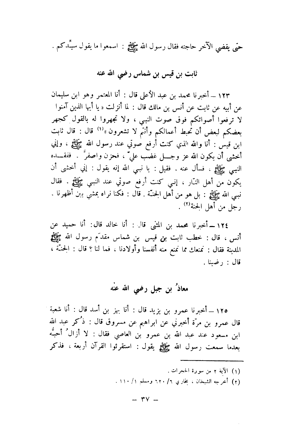 123 - أخبرنَا مُحَمَّد بن عبد الْأَعْلَى قَالَ أَنا الْمُعْتَمِر وَهُوَ ابْن سُلَيْمَان عَن أَبِيه عَن ثَابت عَن أنس بن مَالك قَالَ لما نزلت {يَا أَيهَا الَّذين آمنُوا لَا تَرفعُوا أَصْوَاتكُم فَوق صَوت النَّبِي وَلَا تَجْهَرُوا لَهُ بالْقَوْل كجهر بَعْضكُم لبَعض أَن تحبط أَعمالكُم وَأَنْتُم لَا تشعرون} قَالَ قَالَ ثَابت ابْن قيس أَنا وَالله الَّذِي كنت أرفع صوتي عِنْد رَسُول الله صلى الله عَلَيْهِ وَسلم وَإِنِّي أخْشَى أَن يكون الله عز وَجل غضب عَليّ فَحزن واصفر فَفَقدهُ النَّبِي صلى الله عَلَيْهِ وَسلم فَسَأَلَ عَنهُ فَقيل يَا نَبِي الله إِنَّه يَقُول إِنِّي أخْشَى أَن يكون من أهل النَّار إِنِّي كنت أرفع صوتي عِنْد النَّبِي صلى الله عَلَيْهِ وَسلم فَقَالَ نَبِي الله صلى الله عَلَيْهِ وَسلم بل هُوَ من أهل الْجنَّة قَالَ فَكُنَّا نرَاهُ يمشي بَين أظهرنَا رجل من أهل الْجنَّة