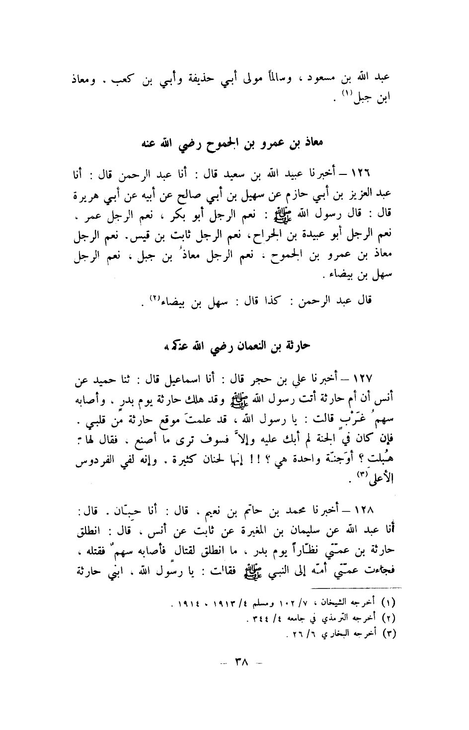 128 - أخبرنَا مُحَمَّد بن حَاتِم بن نعيم قَالَ أَنا حبَان قَالَ أَنا عبد الله عَن سُلَيْمَان بن الْمُغيرَة عَن ثَابت عَن أنس قَالَ انْطلق حَارِثَة بن عَمَّتي نظارا يَوْم بدر مَا انْطلق لقِتَال فَأَصَابَهُ سهم فَقتله فَجَاءَت عَمَّتي أمه إِلَى النَّبِي صلى الله عَلَيْهِ وَسلم فَقَالَت يَا رَسُول الله ابْني حَارِثَة إِن يكن فِي الْجنَّة أَصْبِر وأحتسب وَإِلَّا فسترى مَا أصنع فَقَالَ النَّبِي صلى الله عَلَيْهِ وَسلم يَا أم حَارِثَة إِنَّهَا لجنان كَثِيرَة وَإِن حَارِثَة فِي الفردوس الْأَعْلَى