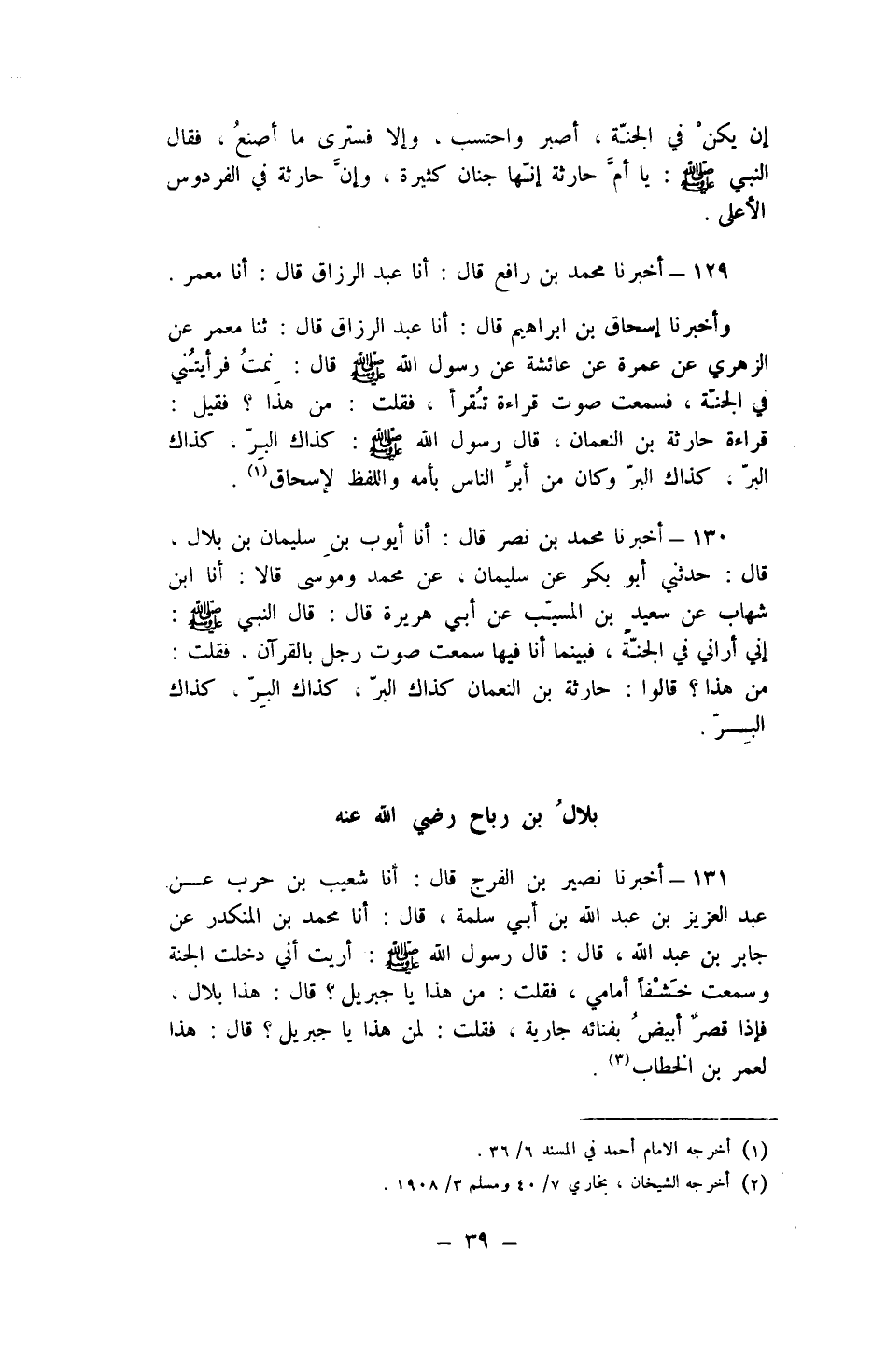 130 - أخبرنَا مُحَمَّد بن نصر قَالَ أَنا أَيُّوب بن سُلَيْمَان بن بِلَال قَالَ حَدثنِي أَبُو بكر عَن سُلَيْمَان عَن مُحَمَّد ومُوسَى قَالَا أَنا ابْن شهَاب عَن سعيد بن الْمسيب عَن أبي هُرَيْرَة قَالَ قَالَ النَّبِي صلى الله عَلَيْهِ وَسلم إِنِّي أَرَانِي فِي الْجنَّة فينما أَنا فِيهَا سَمِعت صَوت رجل يقْرَأ بِالْقُرْآنِ فَقلت من هَذَا قَالُوا حَارِثَة بن النُّعْمَان كَذَاك الْبر كَذَاك الْبر كَذَاك الْبر