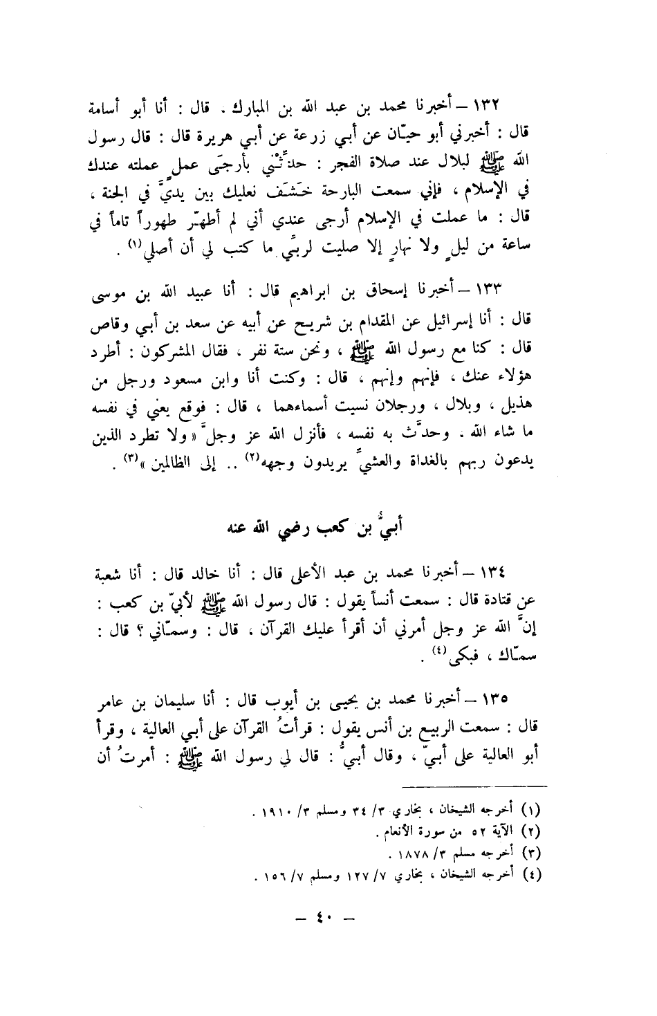 132 - أخبرنَا مُحَمَّد بن عبد الله بن الْمُبَارك قَالَ أَنا أَبُو أُسَامَة قَالَ أَخْبرنِي أَبُو حَيَّان عَن أبي زرْعَة عَن أبي هُرَيْرَة قَالَ قَالَ رَسُول الله صلى الله عَلَيْهِ وَسلم لِبلَال عِنْد صَلَاة الْفجْر حَدثنِي بأرجى عمل عملته عنْدك فِي الْإِسْلَام فَإِنِّي سَمِعت البارحة خشف نعليك بَين يَدي فِي الْجنَّة قَالَ مَا عملت فِي الْإِسْلَام أَرْجَى عِنْدِي أَنِّي لم أطهر طهُورا تَاما فِي سَاعَة من اللَّيْل ليل وَلَا نَهَار إِلَّا صليت لرَبي مَا كتب لي أَن أُصَلِّي