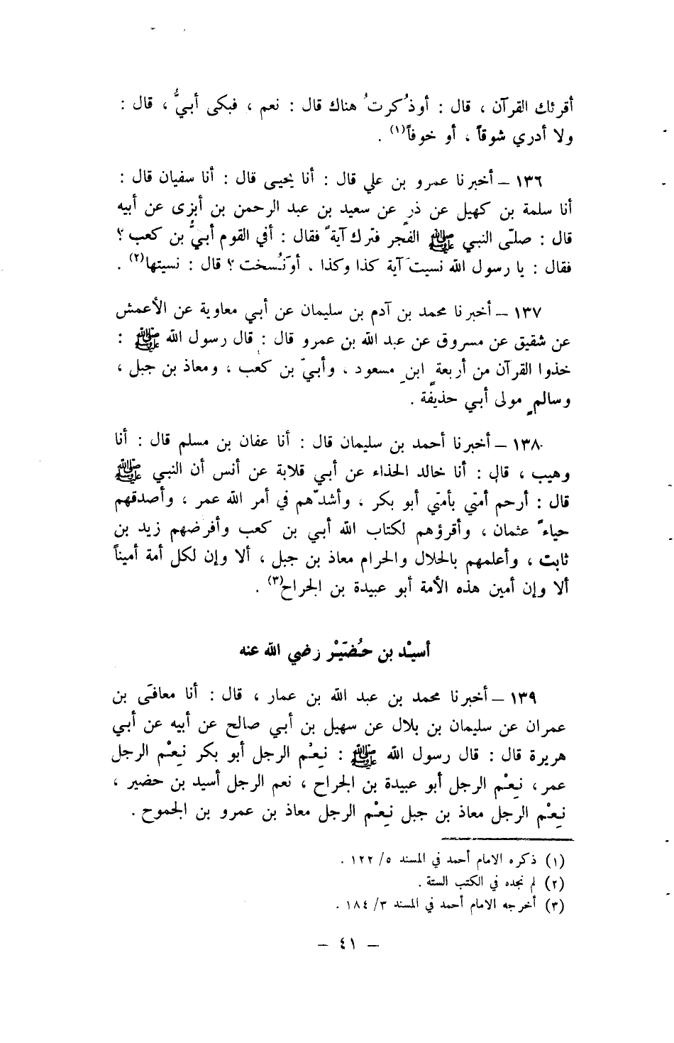 137 - أخبرنَا مُحَمَّد بن آدم بن سُلَيْمَان عَن أبي مُعَاوِيَة عَن الْأَعْمَش عَن شَقِيق عَن مَسْرُوق عَن عبد الله بن عَمْرو قَالَ قَالَ رَسُول الله صلى الله عَلَيْهِ وَسلم خُذُوا الْقُرْآن من أَرْبَعَة ابْن مَسْعُود وَأبي بن كَعْب ومعاذ بن جبل وَسَالم مولى أبي حُذَيْفَة