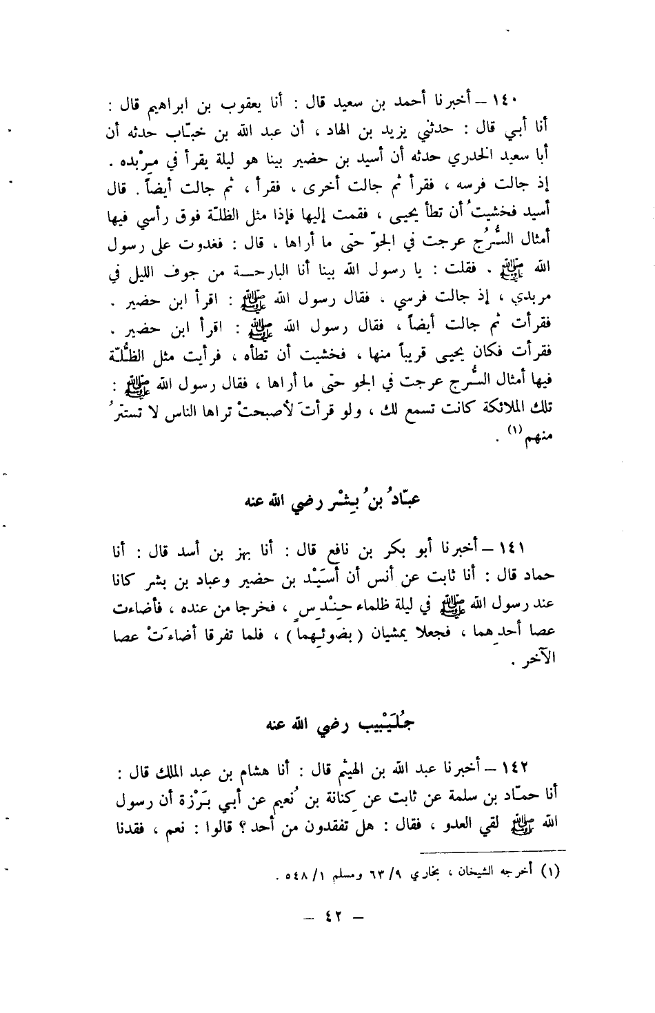140 - أخبرنَا أَحْمد بن سعيد قَالَ أَنا يَعْقُوب بن إِبْرَاهِيم قَالَ أَنا أبي قَالَ حَدثنِي يزِيد بن الْهَاد أَن عبد الله بن خباب حَدثهُ أَن أَبَا سعيد الْخُدْرِيّ حَدثهُ أَن أسيد بن حضير بَينا هُوَ لَيْلَة يقْرَأ فِي مربده إِذْ جالت فرسه فَقَرَأَ ثمَّ جالت أُخْرَى فَقَرَأَ ثمَّ جالت أَيْضا قَالَ أسيد فَخَشِيت أَن تطَأ يحيى فَقُمْت إِلَيْهَا فَإِذا مثل الظلة فَوق رَأْسِي فِيهَا أَمْثَال السرج عرجت فِي الجو حَتَّى مَا أَرَاهَا قَالَ فَغَدَوْت على رَسُول الله صلى الله عَلَيْهِ وَسلم فَقلت يَا رَسُول الله بَينا أَنا البارحة من جَوف اللَّيْل فِي مربدي إِذْ جالت فرسي فَقَالَ رَسُول الله صلى الله عَلَيْهِ وَسلم اقْرَأ ابْن حضير فَقَرَأت ثمَّ جالت أَيْضا فَقَالَ رَسُول الله صلى الله عَلَيْهِ وَسلم اقْرَأ ابْن حضير فَقَرَأت فَكَانَ يحيى قَرِيبا مِنْهَا فَخَشِيت أَن تطأه فَرَأَيْت مثل الظلة فِيهَا أَمْثَال السرج عرجت فِي الجو حَتَّى مَا أَرَاهَا فَقَالَ رَسُول الله صلى الله عَلَيْهِ وَسلم تِلْكَ الْمَلَائِكَة كَانَت تسمع لَك وَلَو قَرَأت لأصبحت ترَاهَا النَّاس لَا تستتر مِنْهُم