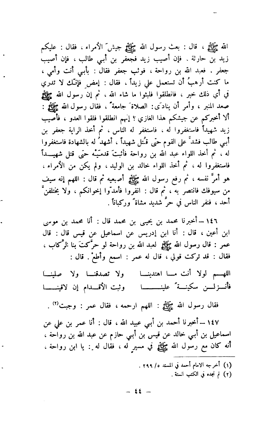 146 - أخبرنَا مُحَمَّد بن يحيى بن مُحَمَّد قَالَ أَنا مُحَمَّد بن مُوسَى ابْن أعين قَالَ أَنا ابْن إِدْرِيس عَن إِسْمَاعِيل عَن قيس قَالَ قَالَ عمر قَالَ رَسُول الله صلى الله عَلَيْهِ وَسلم لعبد الله بن رَوَاحَة لَو حركت بِنَا الركاب فَقَالَ قد تركت قولي قَالَ لَهُ عمر اسْمَع وأطع قَالَ ... اللَّهُمَّ لَوْلَا أَنْت مَا اهتدينا ... وَلَا تصدقنا وَلَا صلينَا