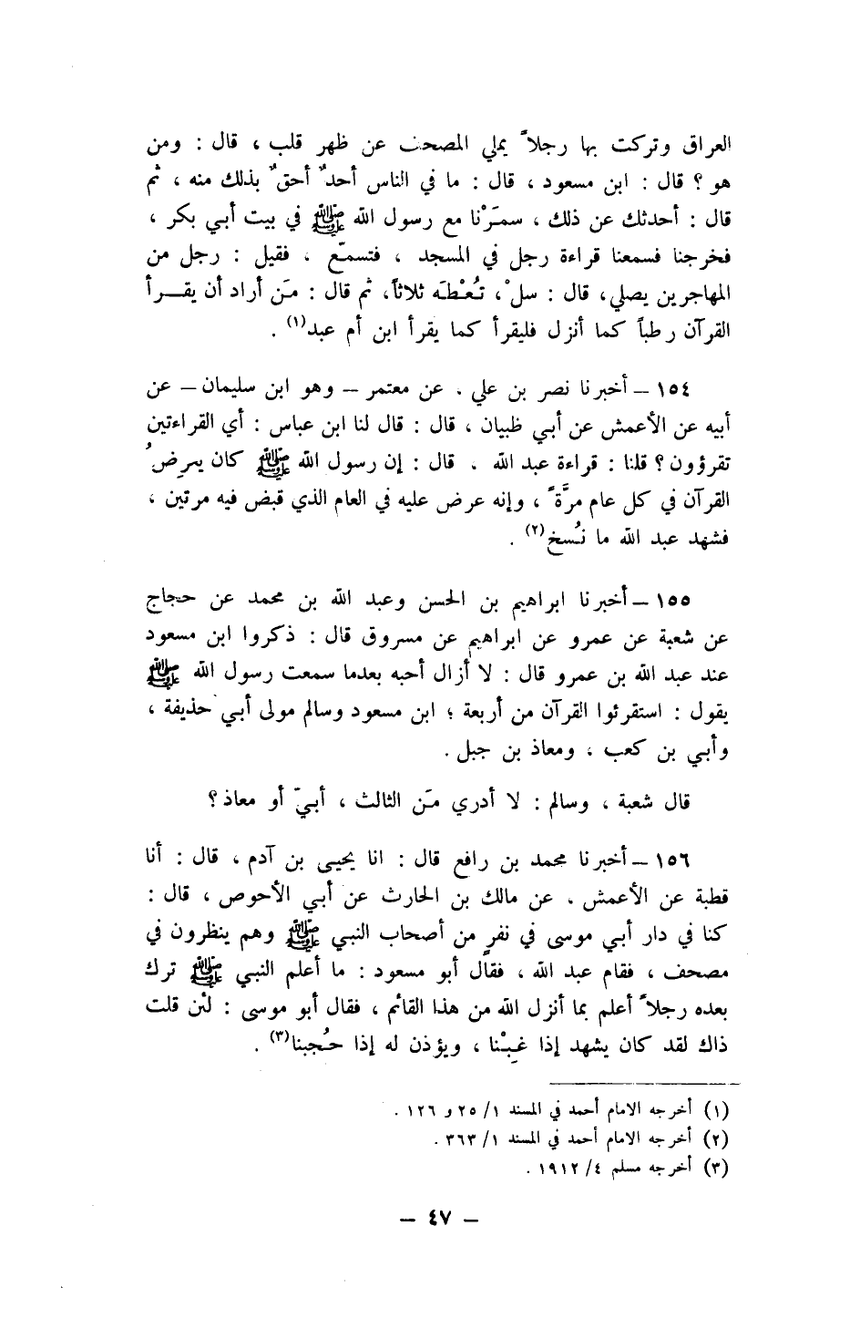155 - أخبرنَا إِبْرَاهِيم بن الْحسن وَعبد الله بن مُحَمَّد عَن حجاج عَن شُعْبَة عَن عَمْرو عَن إِبْرَاهِيم عَن مَسْرُوق قَالَ ذكرُوا ابْن مَسْعُود عِنْد عبد الله بن عَمْرو قَالَ لَا أَزَال أحبه بَعْدَمَا سَمِعت رَسُول الله صلى الله عَلَيْهِ وَسلم يَقُول استقرئوا الْقُرْآن من أَرْبَعَة ابْن مَسْعُود وَسَالم مولى أبي حُذَيْفَة وَأبي بن كَعْب ومعاذ بن جبل