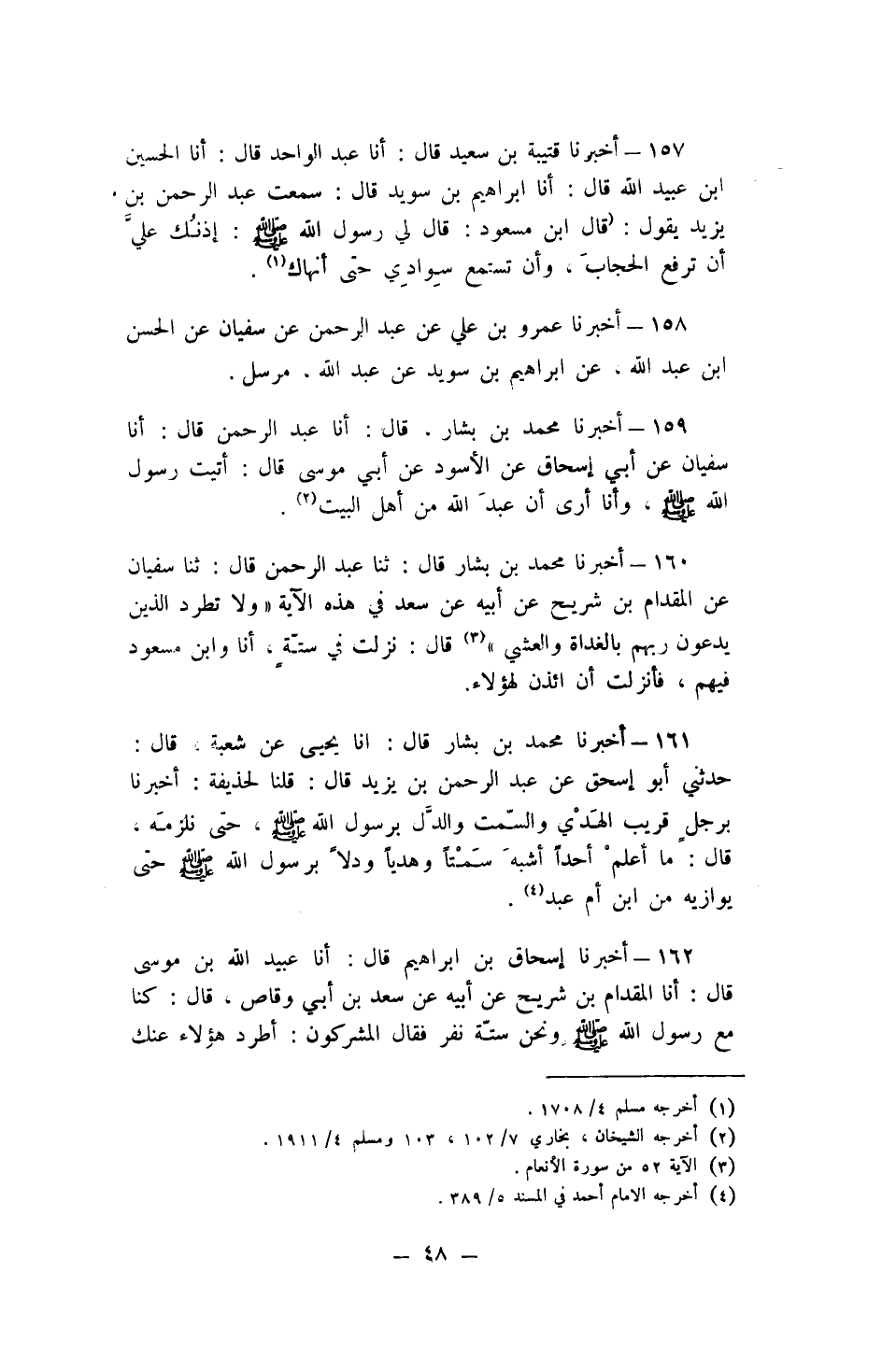 160 - أخبرنَا مُحَمَّد بن بشار قَالَ ثَنَا عبد الرَّحْمَن قَالَ ثَنَا سُفْيَان عَن الْمِقْدَام بن شُرَيْح عَن أَبِيه عَن سعد فِي هَذِه الْآيَة {وَلَا تطرد الَّذين يدعونَ رَبهم بِالْغَدَاةِ والعشي} قَالَ نزلت فِي سِتَّة أَنا وَابْن مَسْعُود فيهم فأنزلت أَن ائْذَنْ لهَؤُلَاء