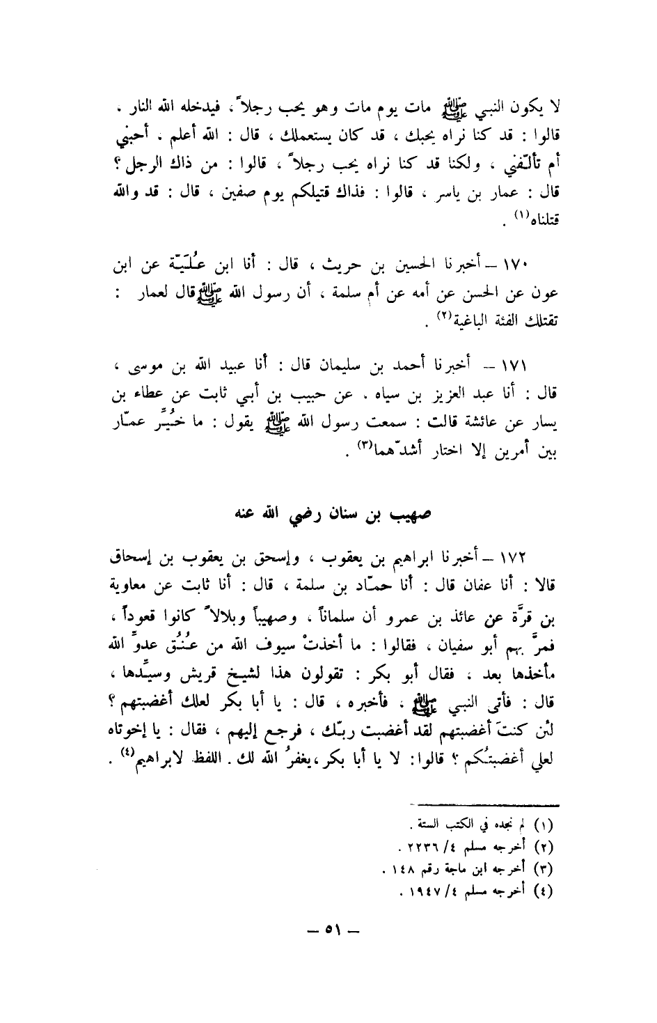 172 - أخبرنَا إِبْرَاهِيم بن يَعْقُوب وَإِسْحَق بن يَعْقُوب بن إِسْحَاق قَالَا أَنا عَفَّان قَالَ أَنا حَمَّاد بن سَلمَة قَالَ أَنا ثَابت عَن مُعَاوِيَة بن قُرَّة عَن عَائِذ بن عَمْرو أَن سلمانا وصهيبا وبلالا كَانُوا قعُودا فَمر بهم أَبُو سُفْيَان فَقَالُوا مَا أخذت سيوف الله من عنق عَدو الله مأخذها بعد فَقَالَ أَبُو بكر تَقولُونَ هَذَا لشيخ قُرَيْش وسيدها قَالَ فَأتى النَّبِي صلى الله عَلَيْهِ وَسلم فَأخْبرهُ قَالَ يَا أَبَا بكر لَعَلَّك أغضبتهم لَئِن كنت أغضبهم لقد أغضبت رَبك فَرجع إِلَيْهِم فَقَالَ يَا إخوتاه لعَلي أغضبتكم قَالُوا لَا يَا أَبَا بكر يغْفر الله لَك اللَّفْظ لإِبْرَاهِيم