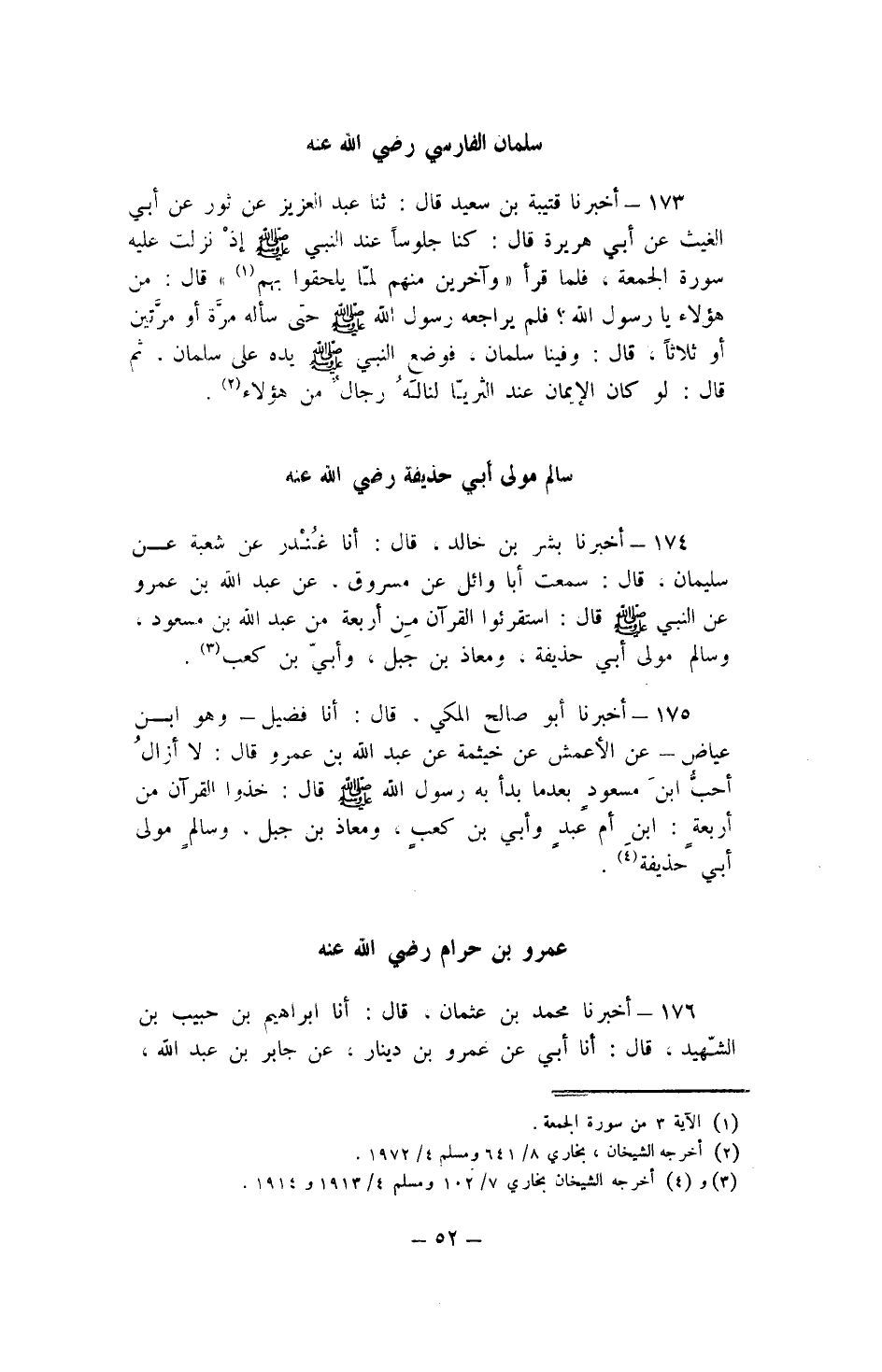174 - أخبرنَا بشر بن خَالِد قَالَ أَنا غنْدر عَن شُعْبَة عَن سُلَيْمَان قَالَ سَمِعت أَبَا وَائِل عَن مَسْرُوق عَن عبد الله بن عَمْرو عَن النَّبِي صلى الله عَلَيْهِ وَسلم قَالَ استقرئوا الْقُرْآن من أَرْبَعَة من عبد الله بن مَسْعُود وَسَالم مولى أبي حُذَيْفَة ومعاذ بن جبل وَأبي بن كَعْب