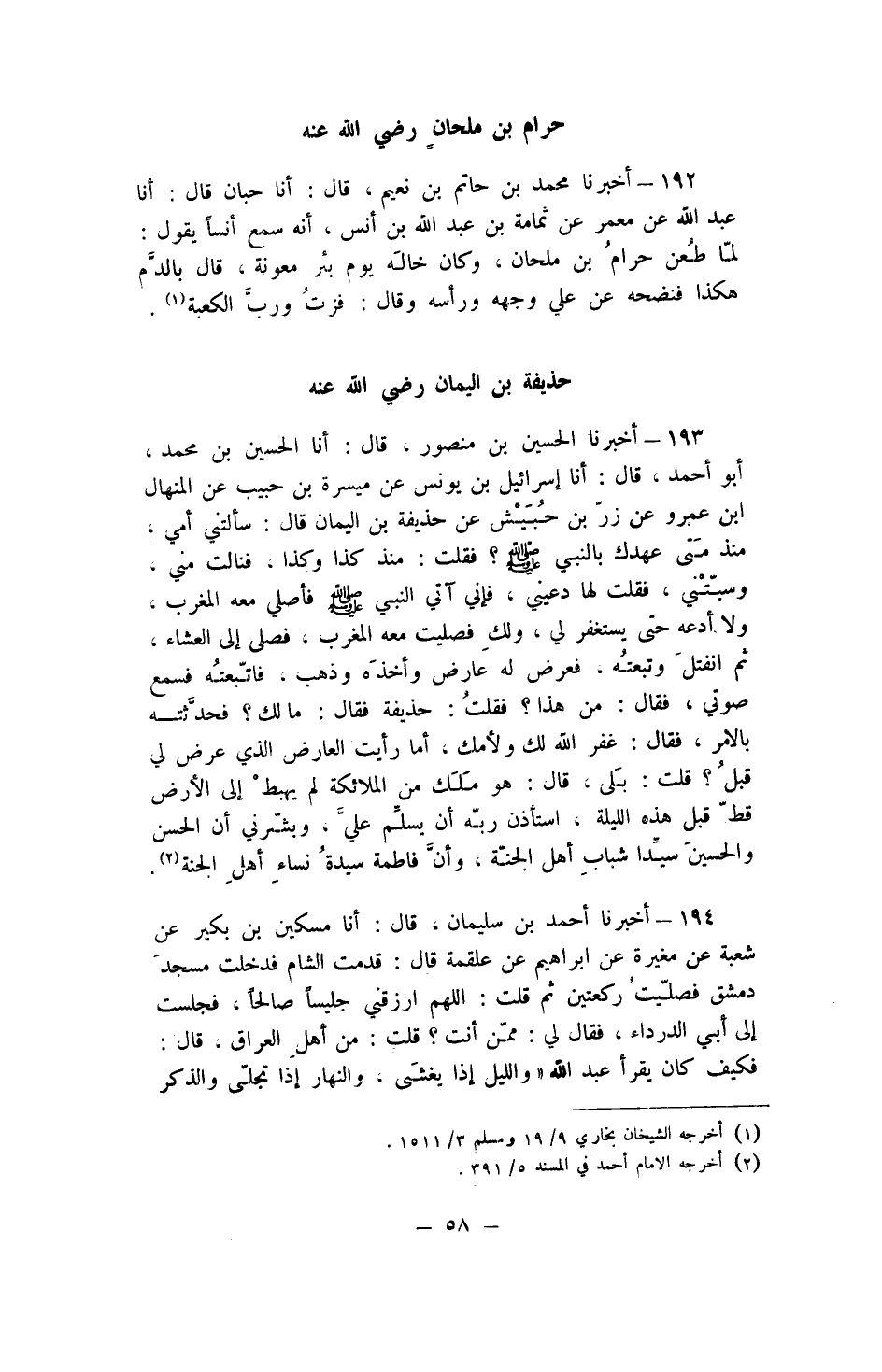 193 - أخبرنَا الْحُسَيْن بن مَنْصُور قَالَ أَنا الْحُسَيْن بن مُحَمَّد أَبُو أَحْمد قَالَ أَنا إِسْرَائِيل بن يُونُس عَن ميسرَة بن حبيب عَن الْمنْهَال ابْن عَمْرو عَن زر بن حُبَيْش عَن حُذَيْفَة بن الْيَمَان قَالَ سَأَلتنِي أُمِّي مُنْذُ مَتى عَهْدك بِالنَّبِيِّ صلى الله عَلَيْهِ وَسلم فَقلت مُنْذُ كَذَا وَكَذَا فنالت مني وسبتني فَقلت لَهَا دعيني فَإِنِّي آتِي النَّبِي صلى الله عَلَيْهِ وَسلم فأصلي مَعَه الْمغرب وَلَا أَدَعهُ حَتَّى يسْتَغْفر لي وَلَك فَصليت مَعَه الْمغرب فصلى إِلَى الْعشَاء ثمَّ انْفَتَلَ وتبعته فَعرض لَهُ عَارض وَأَخذه وَذهب فاتبعته فَسمع صوتي فَقَالَ من هَذَا فَقلت حُذَيْفَة فَقَالَ مَا لَك فَحَدَّثته بِالْأَمر فَقَالَ غفر الله لَك ولأمك أما رَأَيْت الْعَارِض الَّذِي عرض لي قبل قلت بلَى قَالَ هُوَ ملك من الْمَلَائِكَة لم يهْبط إِلَى الأَرْض قطّ قبل هَذِه اللَّيْلَة اسْتَأْذن ربه أَن يسلم عَليّ وبشرني أَن الْحسن وَالْحُسَيْن سيدا شباب أهل الْجنَّة وَأَن فَاطِمَة سيدة نسَاء أهل الْجنَّة