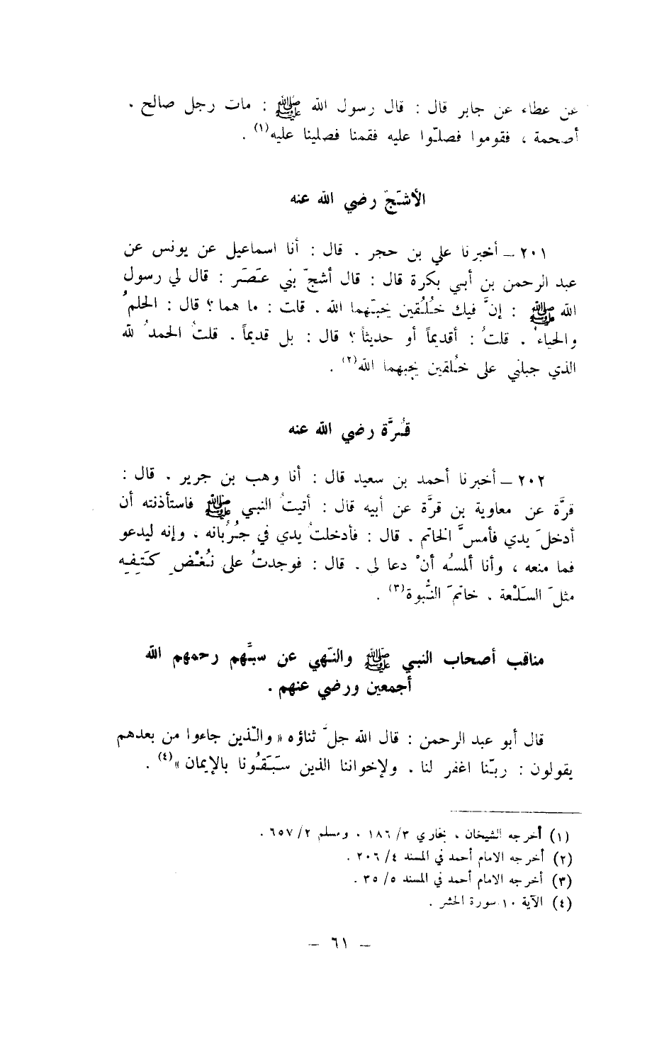 201 - أخبرنَا عَليّ بن حجر قَالَ أَنا إِسْمَاعِيل عَن يُونُس عَن عبد الرَّحْمَن بن أبي بكرَة قَالَ قَالَ أشج بني عصر قَالَ لي رَسُول الله صلى الله عَلَيْهِ وَسلم إِن فِيك خلقين يحبهما الله قلت مَا هما قَالَ الْحلم وَالْحيَاء قلت أقديما أَو حَدِيثا قَالَ بل قَدِيما قلت الْحَمد لله الَّذِي جبلني على خلقين يحبهما الله