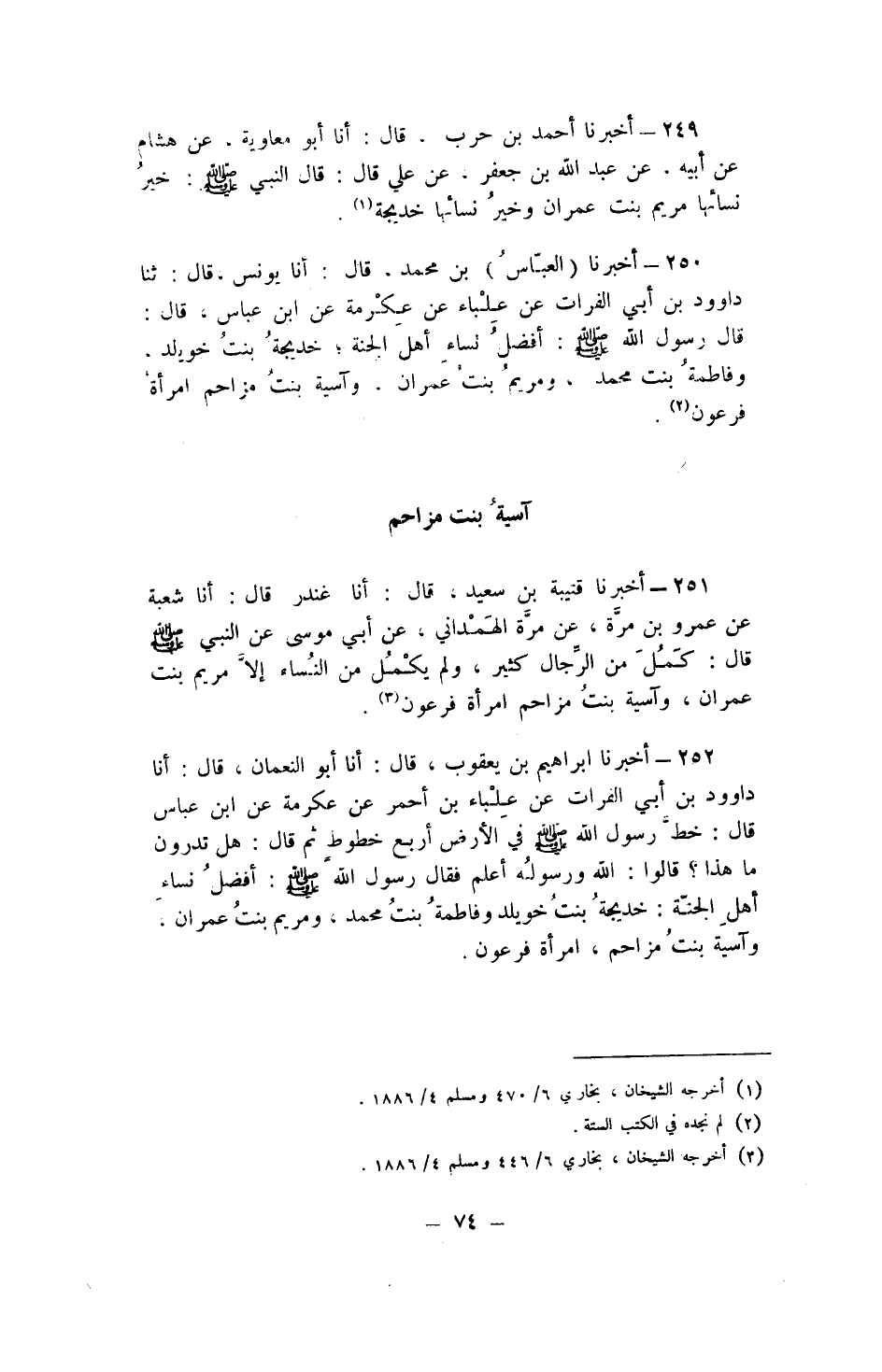 251 - أخبرنَا قُتَيْبَة بن سعيد قَالَ أَنا غنْدر قَالَ أَنا شُعْبَة عَن عَمْرو بن مرّة عَن مرّة الْهَمدَانِي عَن أبي مُوسَى عَن النَّبِي صلى الله عَلَيْهِ وَسلم قَالَ كمل من الرِّجَال كثير وَلم يكمل من النِّسَاء إِلَّا مَرْيَم بنت عمرَان وآسية بنت مُزَاحم امْرَأَة فِرْعَوْن