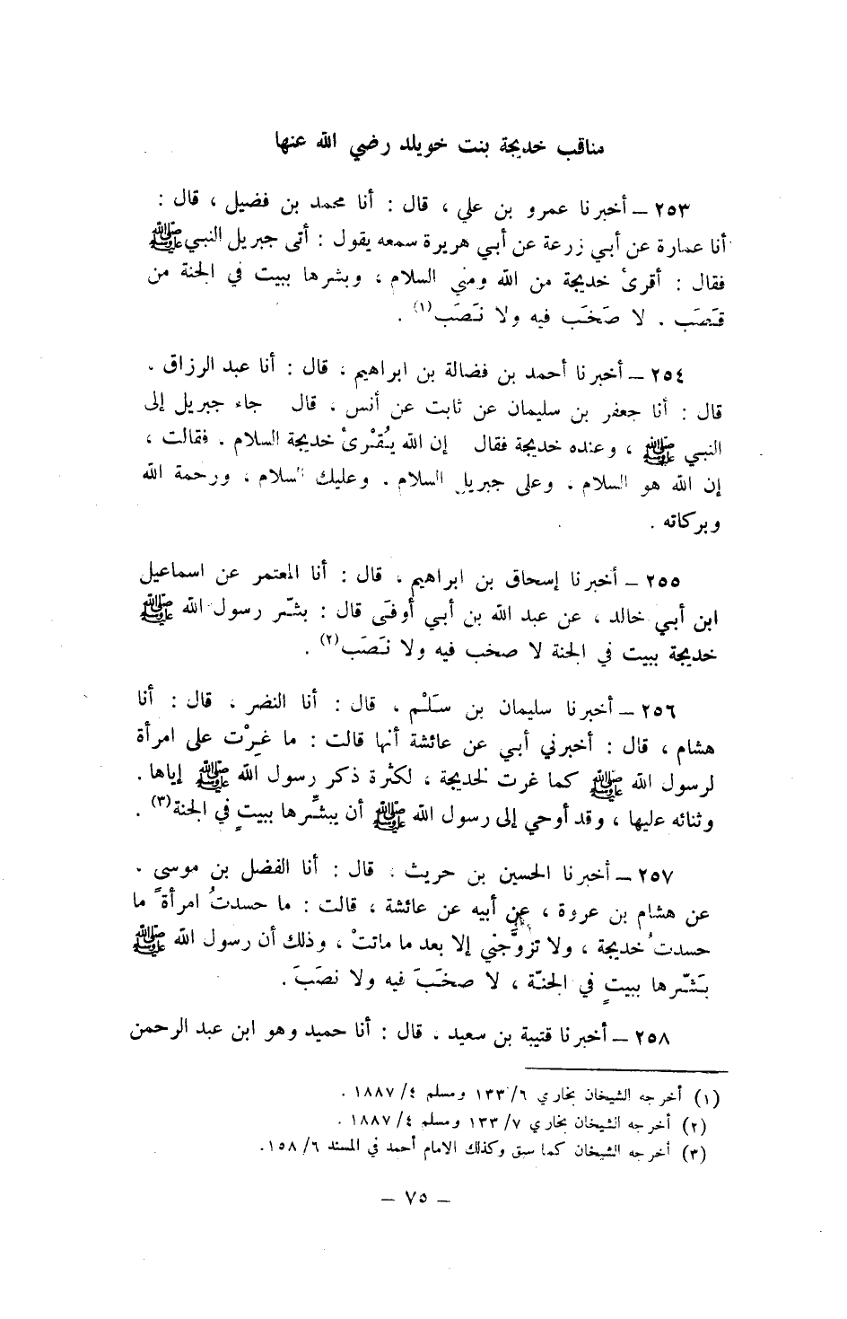 256 - أخبرنَا سُلَيْمَان بن سلم قَالَ أَنا النَّضر قَالَ أَنا هِشَام قَالَ أَخْبرنِي أبي عَن عَائِشَة أَنَّهَا قَالَت مَا غرت على امْرَأَة لرَسُول الله صلى الله عَلَيْهِ وَسلم كَمَا غرت لِخَدِيجَة لِكَثْرَة ذكر رَسُول الله صلى الله عَلَيْهِ وَسلم إِيَّاهَا وثنائه عَلَيْهَا وَقد أُوحِي إِلَى رَسُول الله صلى الله عَلَيْهِ وَسلم أَن يبشرها بِبَيْت فِي الْجنَّة