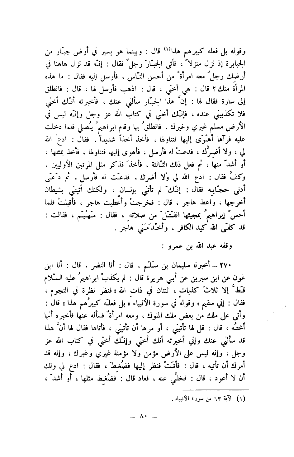 270 - أخبرنَا سُلَيْمَان بن سلم قَالَ أَنا النَّضر قَالَ أَنا ابْن عون عَن ابْن سِيرِين عَن أبي هُرَيْرَة قَالَ لم يكذب إِبْرَاهِيم عَلَيْهِ السَّلَام قطّ إِلَّا ثَلَاث كذبات ثِنْتَانِ فِي ذَات الله {فَنظر نظرة فِي النُّجُوم فَقَالَ إِنِّي سقيم} وَقَوله فِي سُورَة الْأَنْبِيَاء {بل فعله كَبِيرهمْ هَذَا} قَالَ وأتى عَليّ ملك من بعض ملك الْمُلُوك وَمَعَهُ امْرَأَة فَسَأَلَهُ عَنْهَا فَأخْبرهُ أَنَّهَا أُخْته قَالَ قل لَهَا تَأتِينِي أَو مرها أَن تَأتِينِي فَأَتَاهَا فَقَالَ لَهَا أَن هَذَا قد سَأَلَني عَنْك وَإِنِّي أخْبرته أَنَّك أُخْتِي فِي كتاب الله عز وَجل وَإنَّهُ لَيْسَ على الأَرْض مُؤمن وَلَا مُؤمنَة غَيْرِي وَغَيْرك وَإنَّهُ قد أَمرك أَن تَأتيه قَالَ فَأَتَت فَنظر إِلَيْهَا فضغط فَقَالَ ادْع لي وَلَك أَن لَا أَعُود قَالَ فخلي عَنهُ فَعَاد قَالَ فضغط مثلهَا أَو أَشد