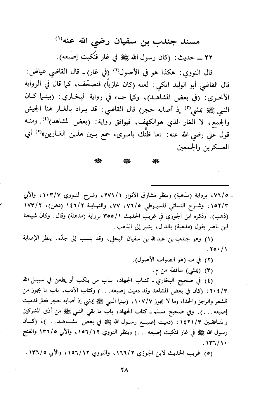 بَيْنَمَا كَانَ النَّبِي صلى الله عَلَيْهِ وَسلم يمشي اذا اصابه حجر قَالَ القَاضِي قد يُرَاد بِالْغَارِ هُنَا الْجَيْش وَالْجمع لَا الْغَار الَّذِي هُوَ الْكَهْف فيوافق رِوَايَة بعض الْمشَاهد وَمِنْه قَول عَليّ رَضِي الله عَنهُ