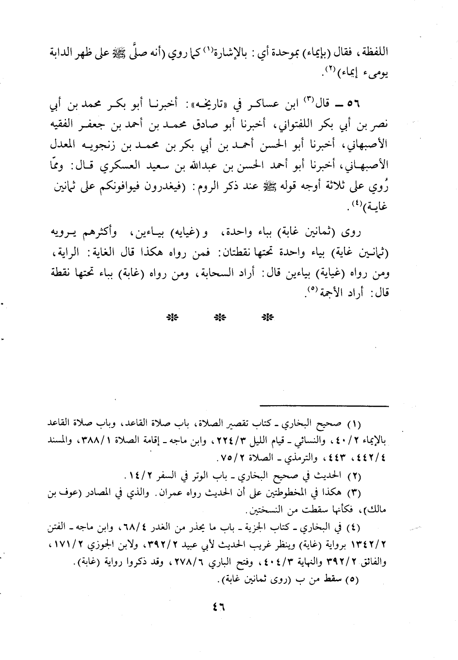 56 - قَالَ ابْن عَسَاكِر فِي تَارِيخه اُخْبُرْنَا ابو بكر مُحَمَّد بن أبي نصر بن أبي بكر اللفتواني اُخْبُرْنَا ابو صَادِق مُحَمَّد بن احْمَد بن جَعْفَر الْفَقِيه الاصبهاني اُخْبُرْنَا ابو الْحسن احْمَد بن أبي بكر بن مُحَمَّد بن زَنْجوَيْه الْمعدل الاصبهاني اُخْبُرْنَا ابو احْمَد الْحسن بن عبد الله بن سعيد العسكري قَالَ وَمِمَّا رُوِيَ على ثَلَاثَة اوجه قَالَ صلى الله عَلَيْهِ وَسلم عِنْد ذكر الرّوم