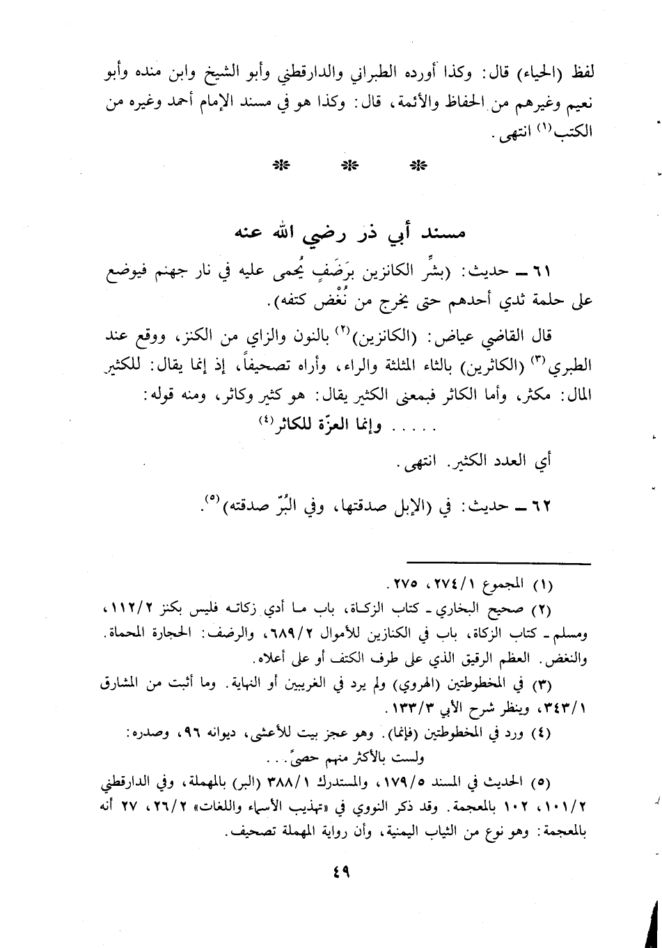 قَالَ القَاضِي عِيَاض الكانزين بالنُّون وَالزَّاي من الْكَنْز وَوَقع عِنْد الطَّبَرِيّ الكاثرين بالثاء الْمُثَلَّثَة وَالرَّاء وَأرَاهُ تصحيفا اذ انما يُقَال للكثير المَال مكثر واما الكاثر فبمعنى الْكثير يُقَال هُوَ كثير وكاثر وَمِنْه قَوْله وانما الْعِزَّة للكاثر