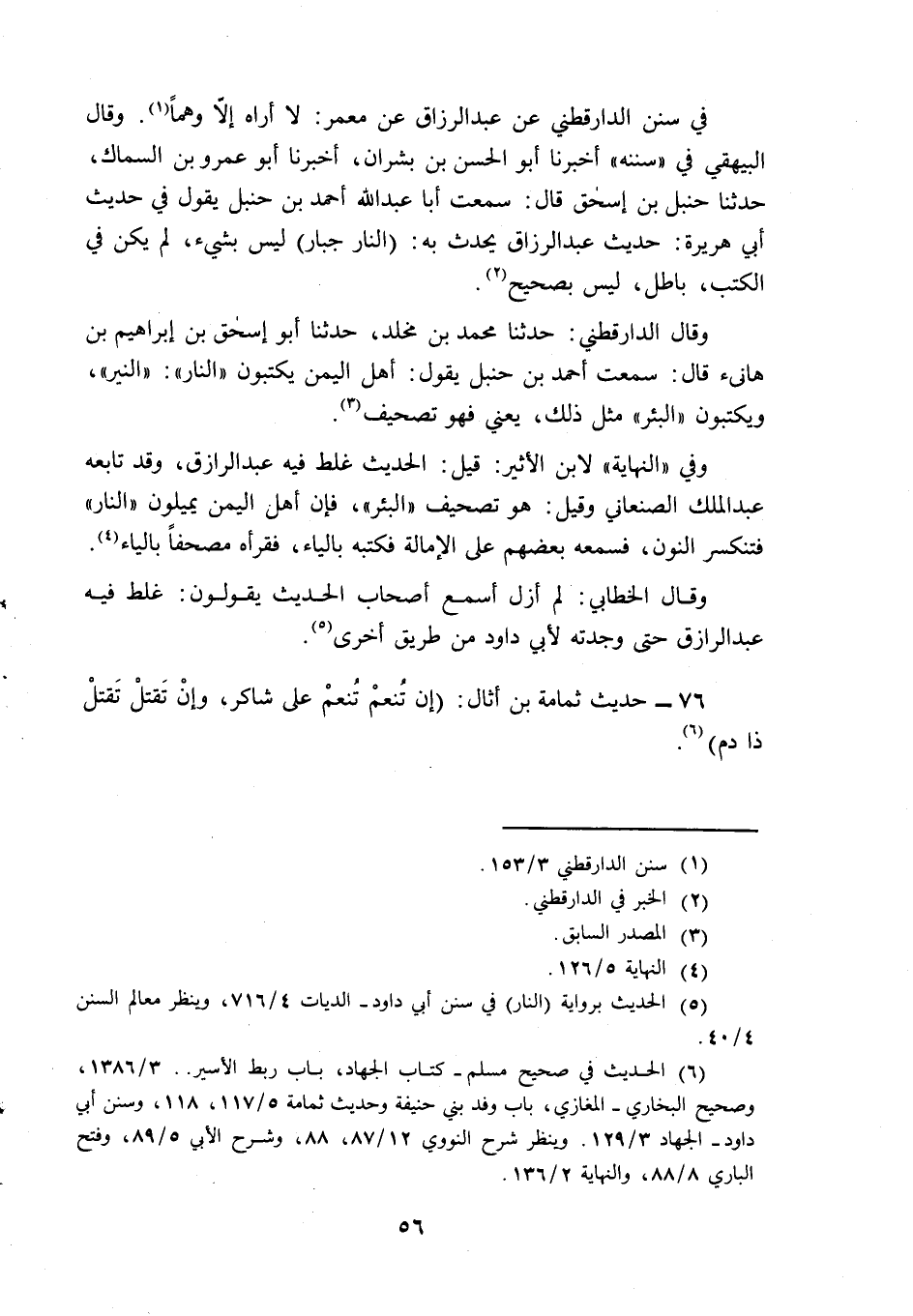 وَفِي سنَن الدَّارَقُطْنِيّ عَن عبد الرَّزَّاق عَن معمر لَا أرَاهُ الا وهما وَقَالَ الْبَيْهَقِيّ سنَنه اُخْبُرْنَا ابو الْحسن بن بَشرَان اُخْبُرْنَا ابو عَمْرو بن السماك حَدثنَا حَنْبَل بن اسحاق قَالَ سَمِعت ابا عبد الله احْمَد بن حَنْبَل يَقُول فِي حَدِيث أبي هُرَيْرَة حَدِيث عبد الرَّزَّاق يحدث بِهِ النَّار جَبَّار لَيْسَ بِشَيْء لم يكن فِي الْكتب بَاطِل لَيْسَ بِصَحِيح