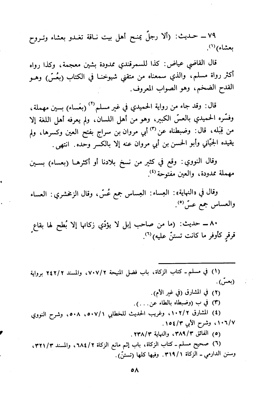 قَالَ وَقد جَاءَ من رِوَايَة الْحميدِي فِي غير مُسلم بعساء بسين مُهْملَة وَفَسرهُ الْحميدِي بالعس الْكَبِير وَهُوَ من أهل اللِّسَان وَلم يعرفهُ اهل اللُّغَة الا من قبله قَالَ وضبطناه عَن أبي مَرْوَان بن سراج بِفَتْح الْعين وَكسرهَا وَلم يُقَيِّدهُ الجياني وابو الْحسن بن أبي مرون عَنهُ الا بِالْكَسْرِ وَحده انْتهى