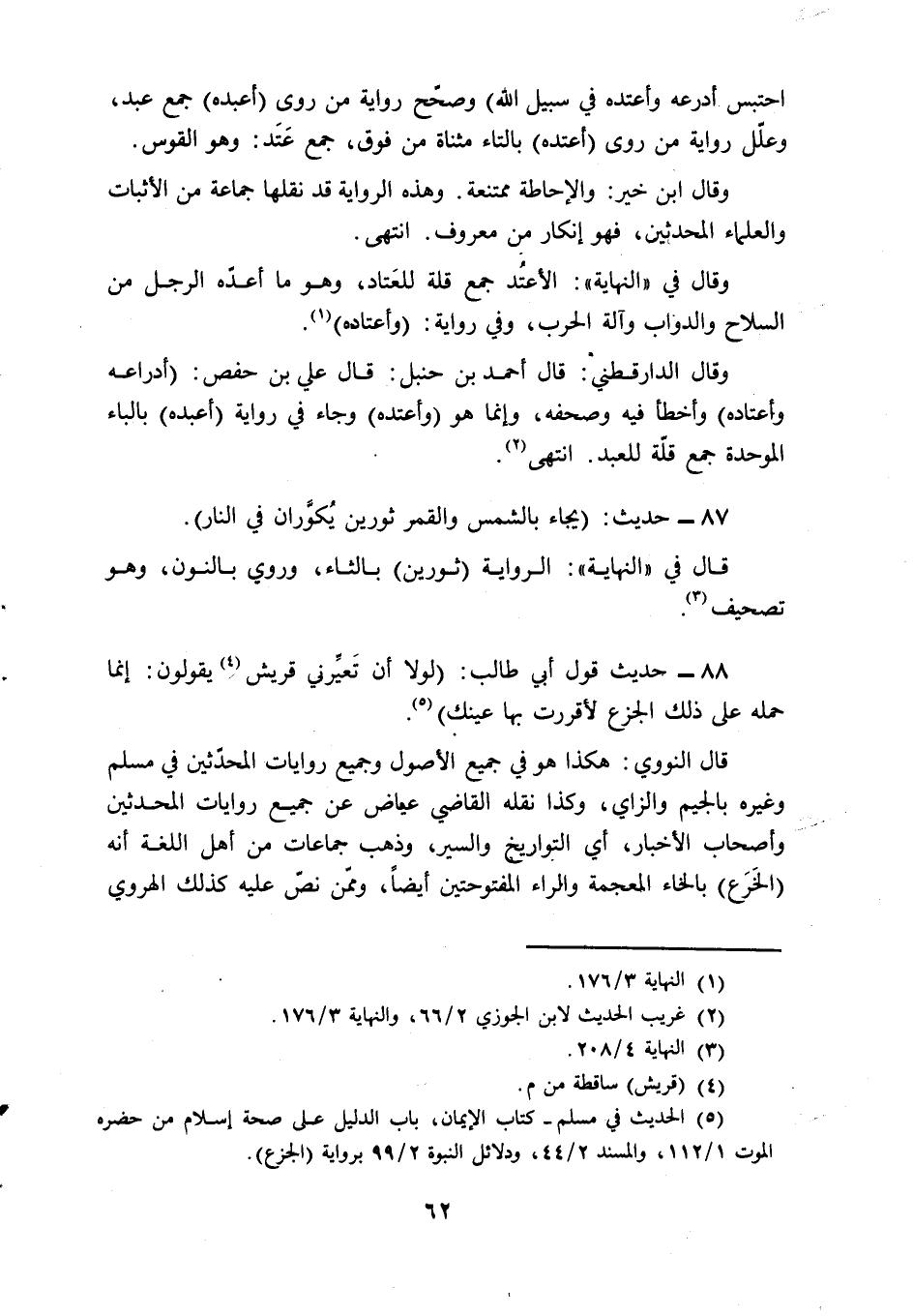 احْتبسَ ادرعه واعتده فِي سَبِيل الله وَصحح رِوَايَة من روى اعبده جمع عبد وَعلل رِوَايَة من روى اعتده بِالتَّاءِ مثناة من فَوق جمع عتد وَهُوَ الْقوس
