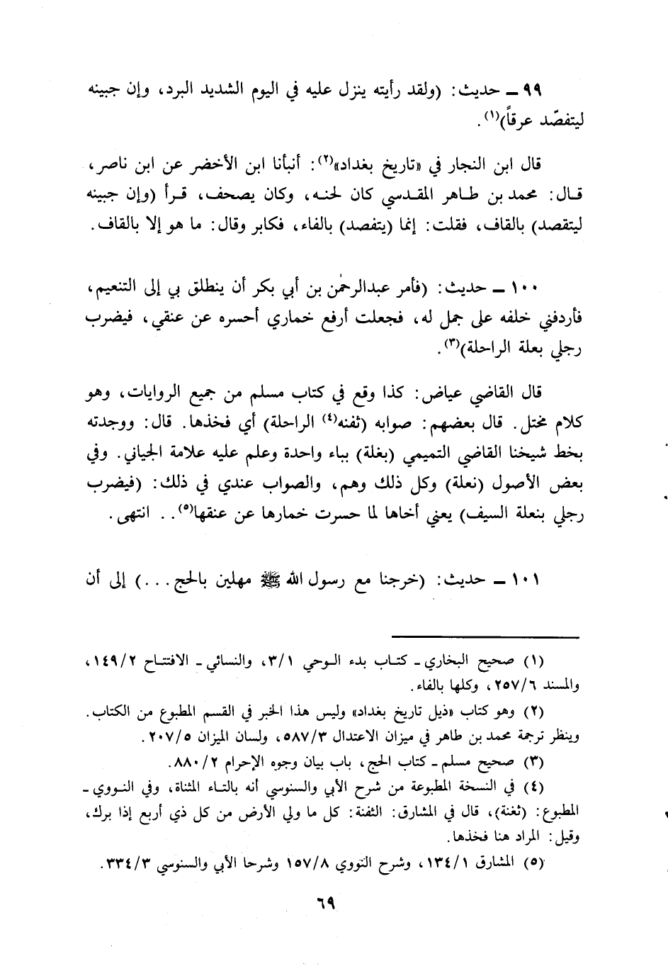 قَالَ القَاضِي عِيَاض كَذَا وَقع فِي كتاب مُسلم من جَمِيع الرِّوَايَات وَهُوَ كَلَام مختل قَالَ بَعضهم صَوَابه ثفنه الرَّاحِلَة أَي فَخذهَا قَالَ وَوَجَدته بِخَط شَيخنَا القَاضِي التَّمِيمِي بغلة بباء وَاحِدَة وَعلم عَلَيْهِ عَلامَة الجياني وَفِي بعض الاوصل نعلة وكل ذَلِك وهم وَالصَّوَاب عِنْدِي فى ذَلِك فَيضْرب رجْلي بنعلة السَّيْف يَعْنِي اخاها لما حسرت خمارها عُنُقهَا انْتهى