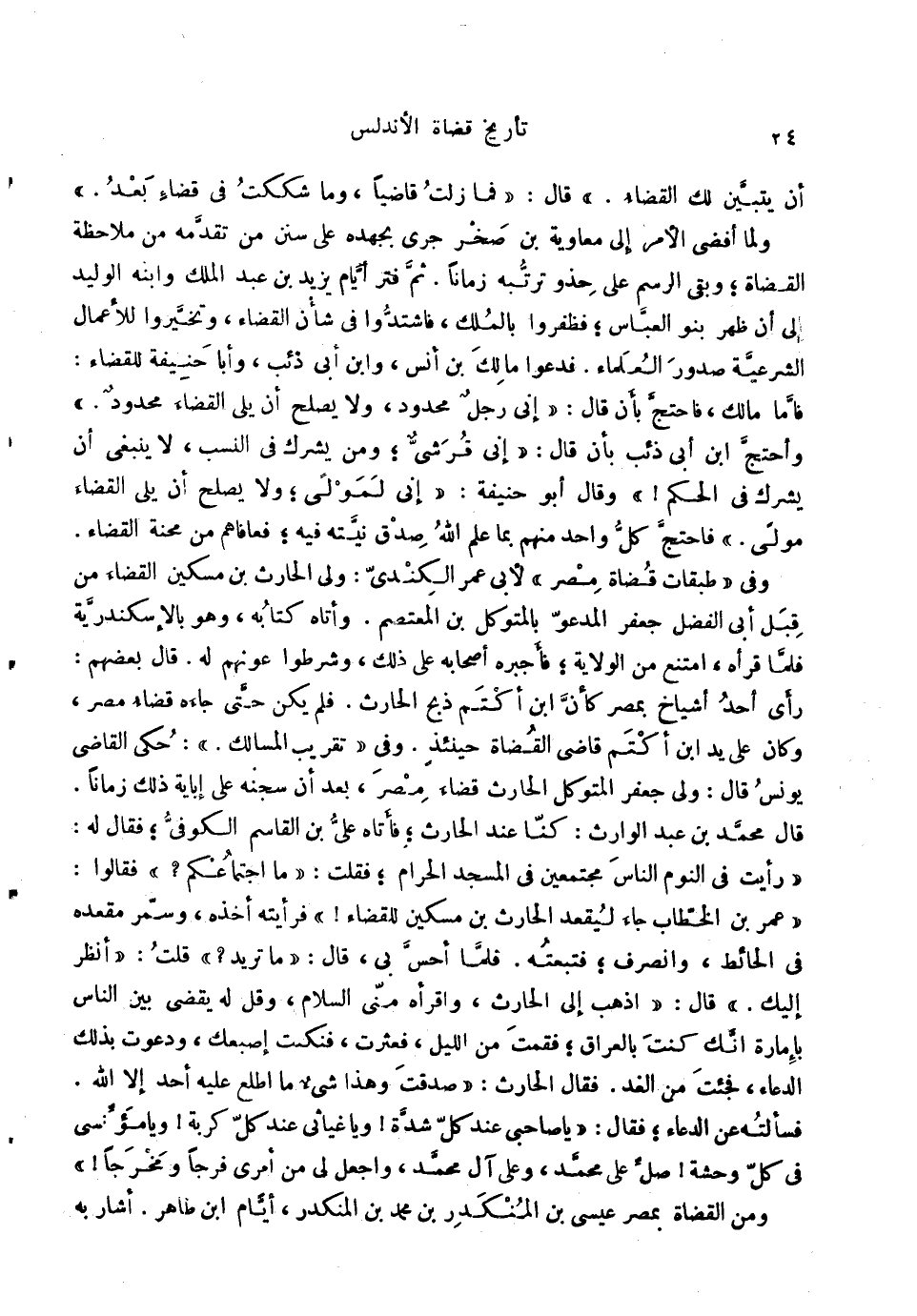 أَن يتَبَيَّن لَك الْقَضَاء. قَالَ: فَمَا زلت قَاضِيا، وَمَا شَككت فِي قَضَاء بعد. وَلما أفْضى الْأَمر إِلَى مُعَاوِيَة بن صَخْر جرى بِجهْدِهِ على سنَن من تقدمه من مُلَاحظَة الْقُضَاة؛ وَبَقِي الرَّسْم على حَذْو ترتبه زَمَانا. ثمَّ فتر أَيَّام يزِيد بن عبد الْملك وَابْنه الْوَلِيد إِلَى أَن ظهر بَنو الْعَبَّاس؛ فظفروا بِالْملكِ، فاشتدوا فِي شَأْن الْقَضَاء، وتخيروا للأعمال الشَّرْعِيَّة صُدُور الْعلمَاء. فدعوا مَالك بن أنس، وَابْن أبي ذِئْب، وَأَبا حنيفَة للْقَضَاء: فَأَما مَالك، فاحتج بِأَن قَالَ: إِنِّي رجل مَحْدُود، وَلَا يصلح أَن يَلِي الْقَضَاء مَحْدُود. وَاحْتج ابْن أبي ذِئْب بِأَن قَالَ: إِنِّي قرشي؛ وَمن يُشْرك فِي النّسَب، لَا يَنْبَغِي أَن يُشْرك فِي الحكم {وَقَالَ أَبُو حنيفَة: إِنِّي لمولي؛ وَلَا يصلح أَن يَلِي الْقَضَاء مولى. فاحتج كل وَاحِد مِنْهُم بِمَا علم الله صدق نِيَّته فِيهِ؛ فعاناهم من محنة الْقَضَاء. وَفِي طَبَقَات قُضَاة مصر لأبي عمر الْكِنْدِيّ: ولي الْحَارِث بن مِسْكين الْقَضَاء من قبل أبي الْفضل جَعْفَر الْمَدْعُو بالمتوكل بن المعتصم. وَأَتَاهُ كِتَابه، وَهُوَ بالإسكندرية فَلَمَّا قَرَأَهُ، امْتنع من الْولَايَة؛ فأجبره أَصْحَابه على ذَلِك، وشرطوا عونهم لَهُ. قَالَ بَعضهم: رأى أحد أَشْيَاخ بِمصْر كَأَن ابْن أكتم ذبح الْحَارِث. فَلم يكن حَتَّى جَاءَهُ قَضَاء مصر، وَكَانَ على يَد ابْن أكتم قَاضِي الْقُضَاة حِينَئِذٍ. وَفِي تغريب المسالك.: حكى القَاضِي يُونُس قَالَ: ولي جَعْفَر المتَوَكل الْحَارِث قَضَاء مصر، بعد أَن سجنه على إباية ذَلِك زَمَانا. قَالَ مُحَمَّد بن عبد الْوَارِث: كُنَّا عِنْد الْحَارِث؛ فَأَتَاهُ عَليّ بن الْقَاسِم الْكُوفِي؛ فَقَالَ لَهُ: رَأَيْت فِي النّوم النَّاس مُجْتَمعين فِي الْمَسْجِد الْحَرَام؛ فَقلت: مَا اجتماعكم؟ فَقَالُوا: عمر بن الْخطاب جَاءَ ليقعد الْحَارِث بن مِسْكين للْقَضَاء} فرأيته أَخذه، وَسمر مَقْعَده فِي الْحَائِط، وَانْصَرف؛ فتبعته، فَلَمَّا أحس بِي، قَالَ: مَا تُرِيدُ؟ قلت: أنظر إِلَيْك. قَالَ: اذْهَبْ إِلَى الْحَارِث، واقرأه مني السَّلَام، وَقل لَهُ يقْضِي بَين النَّاس بإمارة أَنَّك كنت بالعراق؛ فَقُمْت من اللَّيْل، فَعَثَرَتْ، فنكثت إصبعك، ودعوت بذلك الدُّعَاء، فَجئْت من الْغَد. فَقَالَ الْحَارِث: صدقت وَهَذَا شَيْء مَا اطلع عَلَيْهِ أحد إِلَّا الله. فَسَأَلته عَن الدُّعَاء؛ فَقَالَ: يَا صَاحِبي عِنْد كل شدَّة {وَيَا غياثي عِنْد كل كربَة} وَيَا مؤنسي فِي كل وَحْشَة {صل على مُحَمَّد، وعَلى آل مُحَمَّد، وَاجعَل لي من أَمْرِي فرجا ومخرجاً} وَمن الْقُضَاة بِمصْر عِيسَى بن الْمُنْكَدر بن مُحَمَّد بن الْمُنْكَدر، أَيَّام ابْن طَاهِر. أَشَارَ بِهِ