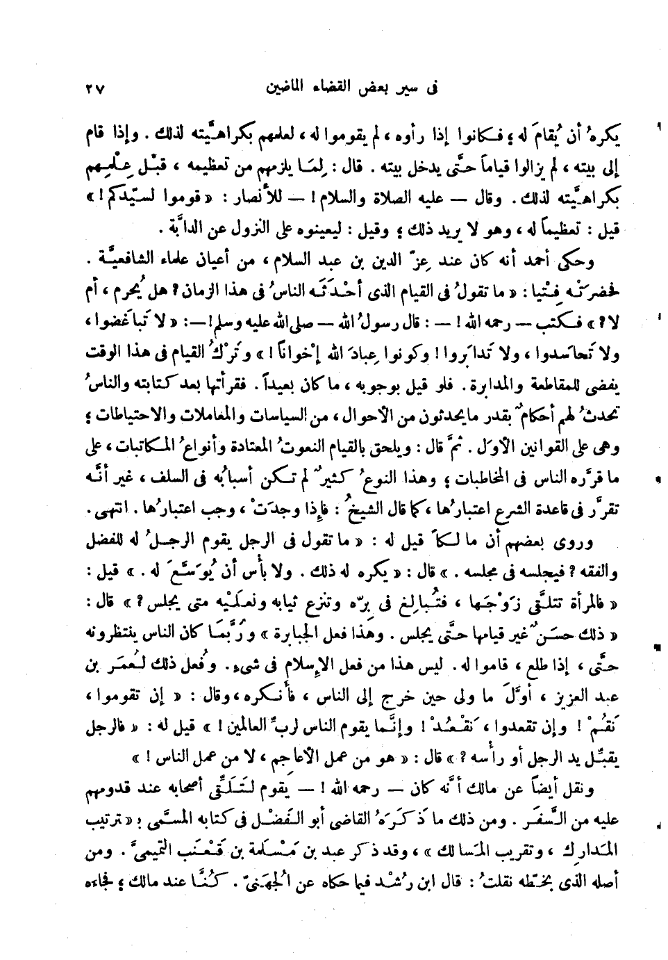 يكره أَن يُقَام لَهُ؛ فَكَانُوا إِذا رَأَوْهُ، لم يقومُوا لَهُ، لعلمهم بكراهيته لذَلِك. وَإِذا قَامَ إِلَى بَيته، لم يزَالُوا قيَاما حَتَّى يدْخل بَيته. قَالَ لما يلْزمهُم من تَعْظِيمه، قبل علمهمْ بكراهيته لذَلِك. وَقَالَ عَلَيْهِ الصَّلَاة وَالسَّلَام {للْأَنْصَار قومُوا لسيدكم} قيل: تَعْظِيمًا لَهُ، وَهُوَ لَا يُرِيد ذَلِك؛ وَقيل: ليعينوه على النُّزُول عَن الدَّابَّة. وَحكى أَحْمد أَنه كَانَ عِنْد عز الدّين بن عبد السَّلَام، من أَعْيَان عُلَمَاء الشَّافِعِيَّة. فحضرته فتيا: مَا تَقول فِي الْقيام الَّذِي أحدثه النَّاس فِي هَذَا الزَّمَان؟ هَل يحرم، أم لَا؟ فَكتب رَحمَه الله {: قَالَ رَسُول الله صلى الله عَلَيْهِ وَسلم} : لَا تباغضوا، وَلَا تَحَاسَدُوا، وَلَا تدابروا {وَكُونُوا عباد الله إخْوَانًا} وَترك الْقيام فِي هَذَا الْوَقْت يفضى للمقاطعة والمدابرة. فَلَو قيل بِوُجُوبِهِ، مَا كَانَ بَعيدا. فقرأتها بعد كِتَابَته وَالنَّاس تحدث لَهُم أَحْكَام بِقدر مَا يحدثُونَ من الْأَحْوَال، من السياسات والمعاملات والاحتياطات؛ وَهِي على القوانين الأول. ثمَّ قَالَ: وَيلْحق بِالْقيامِ النعوت الْمُعْتَادَة وأنواع المكاتبات، على مَا قَرَّرَهُ النَّاس فِي المخاطبات؛ وَهَذَا النَّوْع كثير لم تكن أَسبَابه فِي السّلف، غير أَنه تقرر فِي قَاعِدَته الشَّرْع اعْتِبَارهَا، كَمَا قَالَ الشَّيْخ: فَإِذا وجدت، وَجب اعْتِبَارهَا. انْتهى. وروى بَعضهم أَن مَالِكًا قيل لَهُ: مَا تَقول فِي الرجل يقوم الرجل لَهُ للفضل وَالْفِقْه؟ فيجلسه فِي مَجْلِسه. قَالَ: يكره لَهُ ذَلِك. وَلَا بَأْس أَن يُوسع لَهُ. قيل: فالمرأة تتلقى زَوجهَا، فتبالغ فِي بره وتنزع ثِيَابه ونعليه مَتى يجلس؟ قَالَ: ذَلِك حسن غير قِيَامهَا حَتَّى يجلس. وَهَذَا فعل الْجَبَابِرَة وَرُبمَا كَانَ النَّاس ينتظرونه حَتَّى، إِذا طلع، قَامُوا لَهُ. لَيْسَ هَذَا من فعل الْإِسْلَام فِي شَيْء. وَفعل ذَلِك لعمر بن عبد الْعَزِيز، أول مَا ولي حِين خرج إِلَى النَّاس، فَأنكرهُ، وَقَالَ: إِن تقوموا، نقم {وَإِن تقعدوا} وَإِنَّمَا يقوم النَّاس لرب الْعَالمين {قيل لَهُ: فالرجل يقبل يَد الرجل أَو رَأسه؟ قَالَ: هُوَ من عمل الْأَعَاجِم، لَا من عمل النَّاس} وَنقل أَيْضا عَن مَالك أَنه كَانَ رَحمَه الله! يقوم لتلقي أَصْحَابه عِنْد قدومهم عَلَيْهِ من السّفر. وَمن ذَلِك مَا ذكره القَاضِي أَبُو الْفضل فِي كِتَابه الْمُسَمّى بترتيب المدارك، وتقريب المسالك، وَقد ذكر عبد بن مسلمة بن قعنب التَّمِيمِي. وَمن أَصله الَّذِي بِخَطِّهِ نقلت: قَالَ ابْن رشد فِيمَا حَكَاهُ عَن الْجُهَنِيّ. كُنَّا عِنْد مَالك؛ فَجَاءَهُ