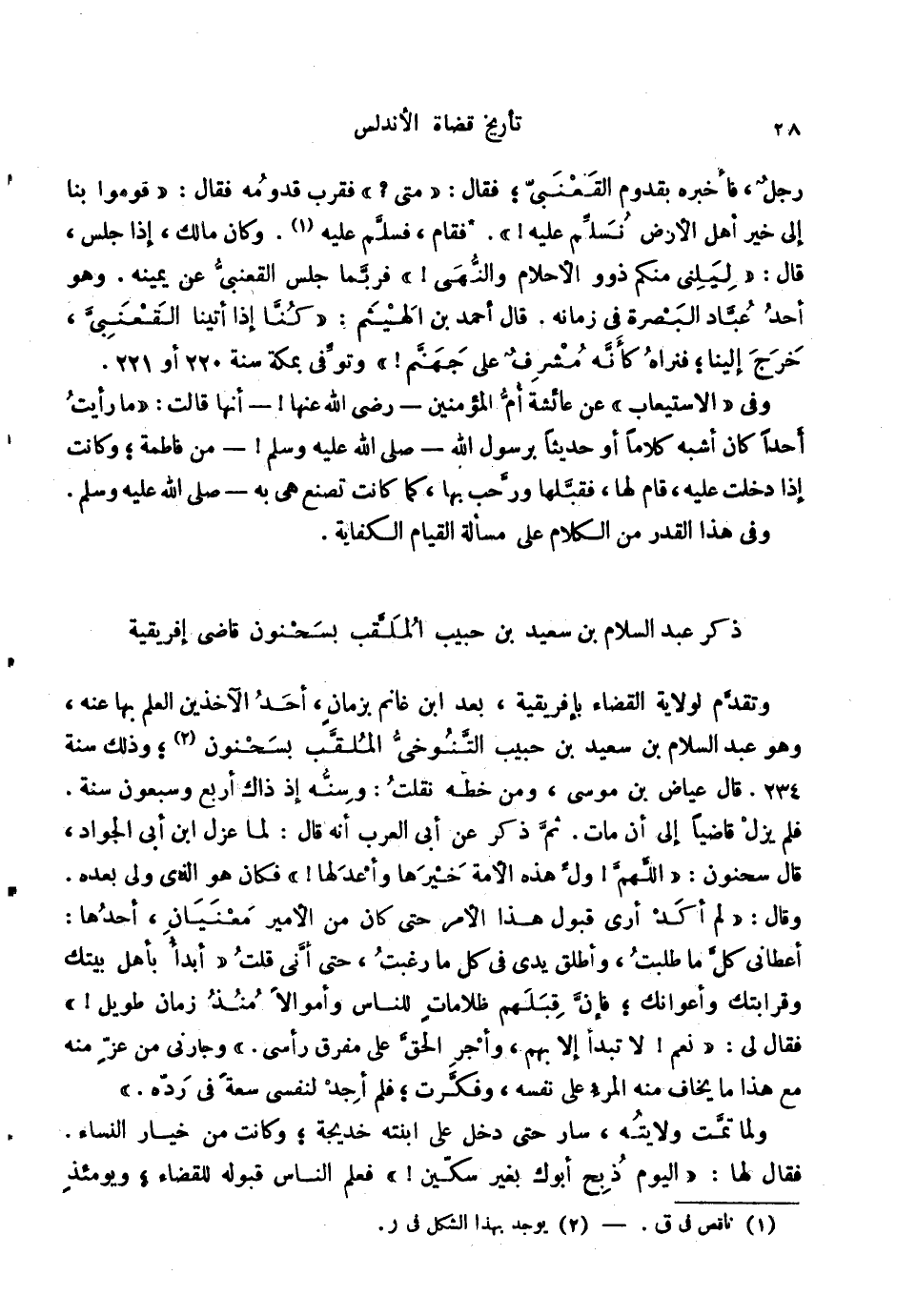 وَتقدم لولاية الْقَضَاء بإفريقية، بعد ابْن غَانِم بِزَمَان، أحد الآخذين الْعلم بهَا عَنهُ، وَهُوَ عبد السَّلَام بن سعيد بن حبيب التنوخي الملقب بسحنون؛ وَذَلِكَ سنة 234. قَالَ عِيَاض بن مُوسَى، وَمن خطه نقلت: وسنه إِذْ ذَاك أَربع وَسَبْعُونَ سنة. فَلم يزل قَاضِيا إِلَى أَن مَاتَ. ثمَّ ذكر عَن أبي الْعَرَب أَنه قَالَ: لما عزل ابْن أبي الْجواد، قَالَ سَحْنُون: اللَّهُمَّ {ولِّ هَذِه الْأمة خَيرهَا وأعدلها} فَكَانَ هُوَ الَّذِي ولي بعده. وَقَالَ: لم أكد أرى قبُول هَذَا الْأَمر حَتَّى كَانَ من الْأَمِير مَعْنيانِ، أَحدهَا: أَعْطَانِي كل مَا طلبت، وَأطلق يَدي فِي كل مَا رغبت، حَتَّى أَنِّي قلت أبدأ بِأَهْل بَيْتك وقرابتك وأعوانك؛ فَإِن قبلهم ظلامات للنَّاس وأموالاً مُنْذُ زمَان طَوِيل {فَقَالَ لي: نعم} لَا تبدأ إِلَّا بهم، وَأجر الْحق على مفرق رَأْسِي. وجارني من عز مِنْهُ مَعَ هَذَا مَا يخَاف مِنْهُ الْمَرْء على نَفسه، وفكرت؛ فَلم أجد لنَفْسي سَعَة فِي رده. وَلما تمت ولَايَته، سَار حَتَّى دخل على ابْنَته خَدِيجَة؛ وَكَانَت من خِيَار النِّسَاء. فَقَالَ لَهَا: الْيَوْم ذبح أَبوك بِغَيْر سكين! فَعلم النَّاس قبُوله للْقَضَاء؛ ويومئذ