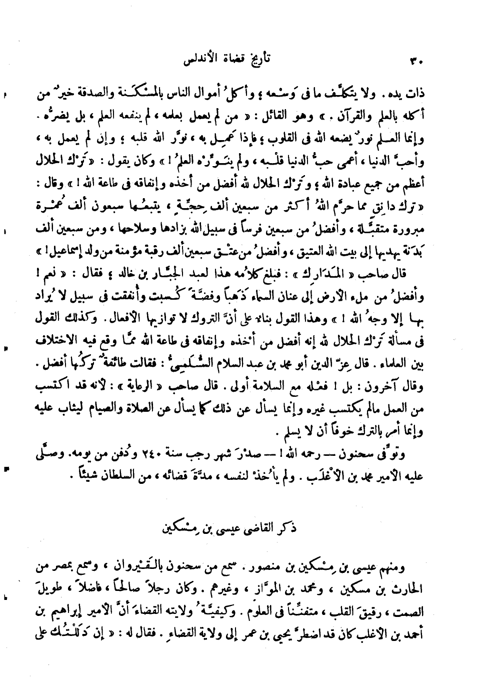 ذَات يَده. وَلَا يتَكَلَّف مَا فِي وَسعه؛ وَأكل أَمْوَال النَّاس بالمسكنة وَالصَّدَََقَة خير من أكله بِالْعلمِ وَالْقُرْآن. وَهُوَ الْقَائِل: من لم يعْمل بِعِلْمِهِ، لم يَنْفَعهُ الْعلم، بل يضرّهُ وَإِنَّمَا الْعلم نور يَضَعهُ الله فِي الْقُلُوب، فَإِذا عمل بِهِ، نور الله قلبه؛ وَإِن لم يعْمل بِهِ، وَأحب الدُّنْيَا، أعمى حب الدُّنْيَا قلبه، وَلم ينوره الْعلم {وَكَانَ يَقُول: ترك الْحَلَال أعظم من جَمِيع عبَادَة الله؛ وَترك الْحَلَال لله أفضل من أَخذ وإنفاقه فِي طَاعَة الله} وَقَالَ: ترك دانق مِمَّا حرم الله أَكثر من سبعين ألف حجَّة، يتبعهَا سَبْعُونَ ألف عمْرَة مبرورة متقبلة، وَأفضل من سبعين فرسا فِي سَبِيل الله بزادها وسلاحها، وَمن سبعين ألف بَدَنَة يهديها إِلَى بَيت الْعَتِيق، وَأفضل من عتق سبعين ألف رَقَبَة مُؤمنَة من ولد إِسْمَاعِيل {قَالَ صَاحب المدارك: فَبلغ كَلَامه هَذَا لعبد الْجَبَّار بن خَالِد؛ فَقَالَ: نعم} وَأفضل من ملْء الأَرْض إِلَى عنان السَّمَاء ذَهَبا وَفِضة كسبت وأنفقت فِي سَبِيل لَا يُرَاد بهَا إِلَّا وَجه الله {وَهَذَا القَوْل بِنَاء على أَن التروك لَا توازيها الْأَفْعَال. وَكَذَلِكَ القَوْل فِي مَسْأَلَة ترك الْحَلَال لله إِنَّه أفضل من أَخذه وإنفاقه فِي طَاعَة الله مِمَّا وَقع فِيهِ الِاخْتِلَاف بَين الْعلمَاء. قَالَ عز الدّين أَبُو مُحَمَّد بن عبد السَّلَام السّلمِيّ: فَقَالَت طَائِفَة تَركهَا أفضل. وَقَالَ آخَرُونَ: بل} فعله مَعَ السَّلامَة أولى. قَالَ صَاحب الرِّعَايَة: لِأَنَّهُ قد اكْتسب من الْعَمَل مَا لم يكْتَسب غَيره وَإِنَّمَا يسْأَل عَن ذَلِك كَمَا يسْأَل عَن الصَّلَاة وَالصِّيَام ليثاب عَلَيْهِ وَإِنَّمَا أَمر بِالتّرْكِ خوفًا أَن لَا يسلم. وَتُوفِّي سَحْنُون رَحمَه الله! صدر شهر رَجَب سنة 240 وَدفن من يَوْمه. وَصلى عَلَيْهِ الْأَمِير مُحَمَّد بن الْأَغْلَب. وَلم يَأْخُذ لنَفسِهِ، مُدَّة قَضَائِهِ، من السُّلْطَان شَيْئا. ذكر القَاضِي عِيسَى بن مِسْكين وَمِنْهُم عِيسَى بن مِسْكين بن مَنْصُور. سمع من سَحْنُون بالقيروان، وَسمع بِمصْر من الْحَارِث بن مِسْكين، وَمُحَمّد بن الْمَوَّاز، وَغَيرهم. وَكَانَ رجلا صَالحا، فَاضلا، طَوِيل الصمت، رَقِيق الْقلب، متفنناً فِي الْعُلُوم. وَكَيْفِيَّة ولَايَته الْقَضَاء أَن الْأَمِير إِبْرَاهِيم بن أَحْمد بن الْأَغْلَب كَانَ قد اضْطر يحيى بن عمر إِلَى ولَايَة الْقَضَاء. فَقَالَ لَهُ: إِن دللتك على
