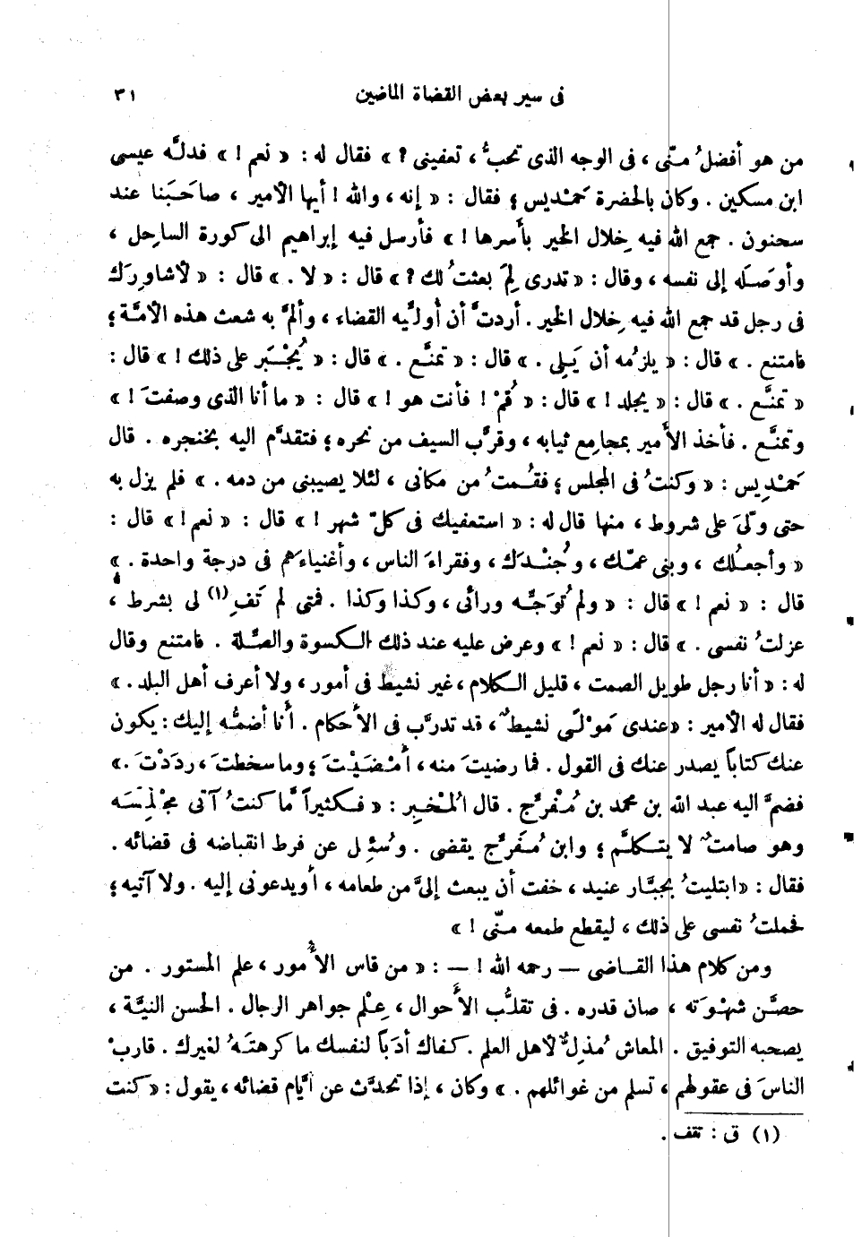 من هُوَ أفضل مني، فِي الْوَجْه الَّذِي تحب، تعفيني فَقَالَ لَهُ: نعم {فدله عِيسَى ابْن مِسْكين. وَكَانَ بالحضرة حمديس؛ فَقَالَ: إِنَّه، وَالله} أَيهَا الْأَمِير، صاحبنا عِنْد سَحْنُون. جمع الله فِيهِ خلال الْخَيْر بأسرها {فَأرْسل فِيهِ إِبْرَاهِيم إِلَى كورة السَّاحِل، وأوصله إِلَى نَفسه، وَقَالَ: تَدْرِي لم بعثت لَك؟ قَالَ: لَا. قَالَ: لأشاورك فِي رجل قد جمع الله فِيهِ خلال الْخَيْر. أردْت أَن أوليه الْقَضَاء، وألم بِهِ شعث هَذِه الْأمة؛ فَامْتنعَ. قَالَ: يلْزمه أَن يَلِي. قَالَ: تمنع. قَالَ: يجْبر على ذَلِك} قَالَ: تمنع. قَالَ: يجلد {قَالَ: قُم} فَأَنت هُوَ {قَالَ: مَا أَنا الَّذِي وصفت} وتمنع. فَأخذ الْأَمِير بِمَجَامِع ثِيَابه، وَقرب السَّيْف من نَحره؛ فَتقدم إِلَيْهِ بخنجره. قَالَ حمديس: وَكنت فِي الْمجْلس؛ فَقُمْت من مَكَاني، لِئَلَّا يُصِيبنِي من دَمه. فَلم يزل بِهِ حَتَّى ولى على شُرُوط، مِنْهَا قَالَ لَهُ: أستعفيك فِي كل شهر {قَالَ: نعم} قَالَ: وأجعلك، وَبني عمك، وجندك، وفقراء النَّاس، وأغنياءهم فِي دَرَجَة وَاحِدَة. قَالَ: نعم {قَالَ: وَلم توجه ورائي، وَكَذَا وَكَذَا. فَمَتَى لم تف لي بِشَرْط، عزلت نَفسِي. قَالَ: نعم} وَعرض عَلَيْهِ عِنْد ذَلِك الْكسْوَة والصلة. فَامْتنعَ وَقَالَ لَهُ: أَنا رجل طَوِيل الصمت، قَلِيل الْكَلَام، غير نشيط فِي أُمُور، وَلَا أعرف أهل الْبَلَد. فَقَالَ لَهُ الْأَمِير: عِنْدِي مولى نشيط، قد تدرب فِي الْأَحْكَام. أَنا أضمه إِلَيْك: يكون عَنْك كتابا يصدر عَنْك فِي القَوْل. فَمَا رضيت مِنْهُ، أمضيت؛ وَمَا سخطت، رددت. فضم إِلَيْهِ عبد الله بن مُحَمَّد بن مفرج. قَالَ الْمخبر: فكثيراً مَا كنت آتِي مَجْلِسه وَهُوَ صَامت لَا يتَكَلَّم؛ وَابْن مفرج يقْضى. وَسُئِلَ عَن فرط انقباضه فِي قَضَائِهِ. فَقَالَ: ابْتليت بجبار عنيد، خفت أَن يبْعَث إِلَيّ من طَعَامه، أَو يدعوني إِلَيْهِ. وَلَا آتيه؛ فَحملت نَفسِي على ذَلِك، ليقطع طمعه مني {وَمن كَلَام هَذَا القَاضِي رَحمَه الله} : من قَاس الْأُمُور، علم المستور. من حصن شَهْوَته، صان قدره. فِي تقلب الْأَحْوَال، علم جَوَاهِر الرِّجَال. الْحسن النِّيَّة، يَصْحَبهُ التَّوْفِيق. المعاش مذل لأهل الْعلم. كَفاك أدباً لنَفسك مَا كرهته لغيرك. قَارب النَّاس فِي عُقُولهمْ، تسلم من غوائلهم. وَكَانَ، إِذا تحدث عَن أَيَّام قَضَائِهِ، يَقُول: كنت