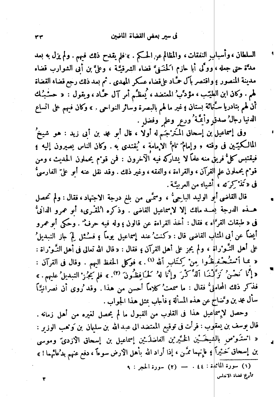 السُّلْطَان، وَأَسْبَاب النَّفَقَات، والمظالم عَن الحكم. فَلم يقْدَح ذَلِك فيهم. وَلم يزل بِهِ بعد مُدَّة حَتَّى جعله، وَولى أَبَا حَازِم الْحَنَفِيّ قَضَاء الشرقية، وَعلي بن أبي الشَّوَارِب قَضَاء مَدِينَة الْمَنْصُور؛ وَكَانَ ابْن الطّيب، مؤدب المعتضد، يعظم أَمر آل حَمَّاد، وَيَقُول: حَسبك أَن لَهُم بتادريا سِتّمائَة بُسْتَان؛ غير مَا لَهُم بِالْبَصْرَةِ وَسَائِر النواحي. وَكَانَ فيهم على اتساع الدُّنْيَا رجال صدق وأيمة ورع وَعلم وَفضل. وَفِي إِسْمَاعِيل بن إِسْحَاق المترجم لَهُ أَولا، قَالَ أَبُو مُحَمَّد بن أبي زيد: هُوَ شيخ المالكيين فِي وقته، وَإِمَام تَامّ الْإِمَامَة، يقْتَدى بِهِ. وَكَانَ النَّاس يصيرون إِلَيْهِ؛ فيقتبس كل فريق مِنْهُ علما لَا يُشَارِكهُ فِيهِ الْآخرُونَ: فِيمَن قوم يحملون الحَدِيث، وَمن قوم يحملون علم الْقُرْآن، وَالْقِرَاءَة، وَالْفِقْه، وَغير ذَلِك. وَقد نقل عَنهُ أَبُو عَليّ الْفَارِسِي فِي تَذكرته أَشْيَاء من الْعَرَبيَّة. قَالَ القَاضِي أَبُو الْوَلِيد الْبَاجِيّ، وسمى من بلغ دَرَجَة الِاجْتِهَاد، فَقَالَ: وَلم تحصل هَذِه الدرجَة بعد مَالك إِلَّا لإسماعيل القَاضِي. وَذكره الْمُقْرِئ أَبُو عَمْرو الداني فِي طَبَقَات الْقُرَّاء فَقَالَ: أَخذ الْقِرَاءَة عَن قالون؛ وَله فِيهِ حرف. وَحكى أَبُو عَمْرو أَيْضا عَن أبي المثاب القَاضِي قَالَ: كنت عِنْد إِسْمَاعِيل يَوْمًا؛ فَسئلَ لم جَازَ التبديل على أهل التَّوْرَاة، وَلم يجز على أهل الْقُرْآن؛ فَقَالَ: قَالَ الله تَعَالَى فِي أهل التَّوْرَاة: " بِمَا استحفظوا من كتاب الله ". فَوكل الْحِفْظ إِلَيْهِم. وَقَالَ فِي الْقُرْآن: " إِنَّا نَحن نزلنَا الذّكر وَإِنَّا لَهُ لحافظون. " فَلم يجز التبديل عَلَيْهِم. فَذكر ذَلِك الْمحَامِلِي فَقَالَ: مَا سَمِعت كلَاما أحسن من هَذَا. وَقد روى أَن نَصْرَانِيّا سَأَلَ مُحَمَّد بن وضاح عَن هَذِه الْمَسْأَلَة؛ فَأجَاب بِمثل هَذَا الْجَواب. وَحصل لإسماعيل هَذَا فِي الْقُلُوب من الْقبُول مَا لم يحصل لغيره من أهل زَمَانه. قَالَ يُوسُف بن يَعْقُوب: قَرَأت فِي توقيع المعتضد إِلَى عبد الله بن سُلَيْمَان بن وهب الْوَزير: اسْتَوْصِ بالشيخين الخيرين الفاضلين إِسْمَاعِيل بن إِسْحَاق الْأَزْدِيّ ومُوسَى بن إِسْحَاق خيرا؛ فَإِنَّهُمَا مِمَّن، إِذا أَرَادَ الله بِأَهْل الأَرْض سوءا، دفع عَنْهُم بدعائهما!