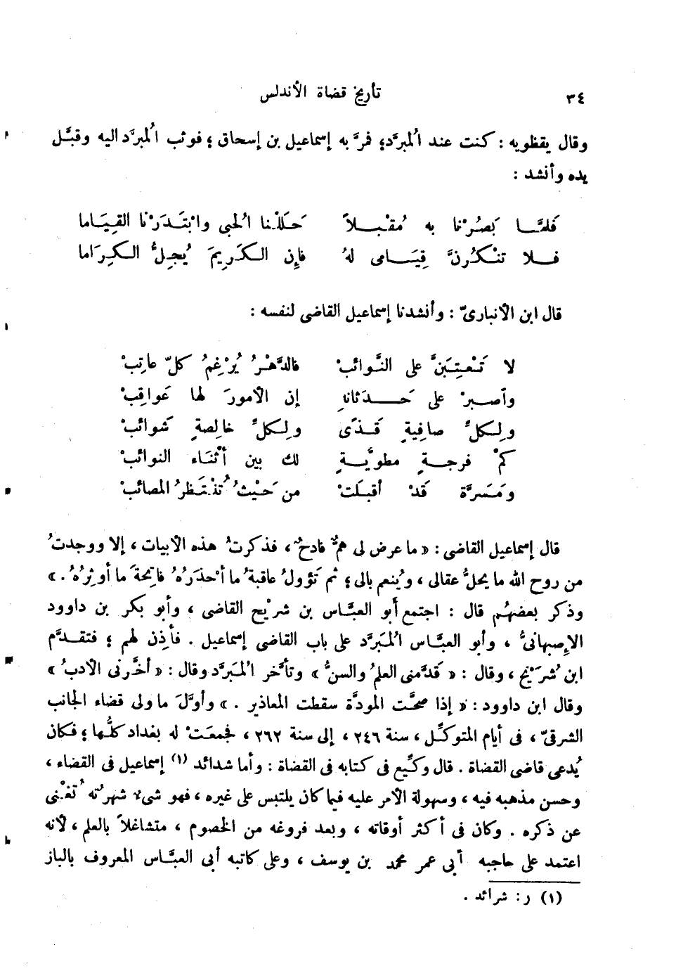 وَقَالَ يقظويه: كنت عِنْد الْمبرد؛ فَمر بِهِ إِسْمَاعِيل بن إِسْحَاق؛ فَوَثَبَ الْمبرد إِلَيْهِ وَقبل يَده وَأنْشد: فَلَمَّا بصرنا بِهِ مُقبلا ... حللنا الحبي وابتدرنا القياما فَلَا تنكرن قيامي لَهُ ... فَإِن الْكَرِيم يجل الكراما قَالَ ابْن الْأَنْبَارِي: وأنشدنا إِسْمَاعِيل القَاضِي لنَفسِهِ: لَا تعتبن على النوائب ... فالدهر يرغم كل عَاتب واصبر على حدثانا ... إِن الْأُمُور لَهَا عواقب وَلَكِن صَافِيَة قذى ... وَلكُل خَالِصَة شوائب كم فُرْجَة مطوية ... لَك بَين أثْنَاء النوائب ومسرة قد أَقبلت ... من حَيْثُ تنْتَظر المصائب قَالَ إِسْمَاعِيل القَاضِي: مَا عرض لي هم فادح، فَذكرت هَذِه الأبيات، إِلَّا وَوجدت من روح الله مَا يحل عقالي، وينعم بالي؛ ثمَّ تؤول عَاقِبَة مَا أحذره فَاتِحَة مَا أوثره. وَذكر بَعضهم قَالَ: اجْتمع أَبُو الْعَبَّاس بن شُرَيْح القَاضِي، وَأَبُو بكر بن دَاوُود الإصبهاني، وَأَبُو الْعَبَّاس الْمبرد على بَاب القَاضِي إِسْمَاعِيل. فَأذن لَهُم؛ فَتقدم ابْن شُرَيْح، وَقَالَ: قدمني الْعلم وَالسّن وَتَأَخر الْمبرد وَقَالَ: أخرني الْأَدَب وَقَالَ ابْن دَاوُود: إِذا صحت الْمَوَدَّة سَقَطت المعاذير. وَأول مَا ولى قَضَاء الْجَانِب الشَّرْقِي، فِي أَيَّام المتَوَكل، سنة 246، إِلَى سنة 262، فَجمعت لَهُ بَغْدَاد كلهَا؛ فَكَانَ يَدعِي قَاضِي الْقُضَاة. قَالَ وَكِيع فِي كِتَابه فِي الْقُضَاة: وَأما شَدَائِد إِسْمَاعِيل فِي الْقَضَاء، وَحسن مذْهبه فِيهِ، وسهولة الْأَمر عَلَيْهِ فِيمَا كَانَ يلتبس على غَيره، فَهُوَ شَيْء شهرته تغنى عَن ذكره. وَكَانَ فِي أَكثر أوقاته، وَبعد فروغه من الْخُصُوم، متشاغلاً بِالْعلمِ، لِأَنَّهُ اعْتمد على حَاجِبه أبي عمر مُحَمَّد بن يُوسُف، وَعلي كَاتبه أبي الْعَبَّاس الْمَعْرُوف بالباز
